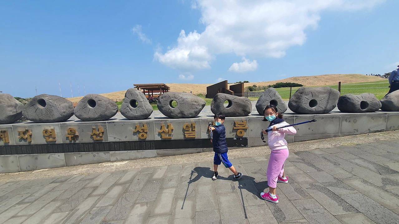 "아들딸, 제주에서 아주 유명한 곳에 안 가 볼래? 아아아아 아주 오래전에 화산이 폭발한 곳 이래."