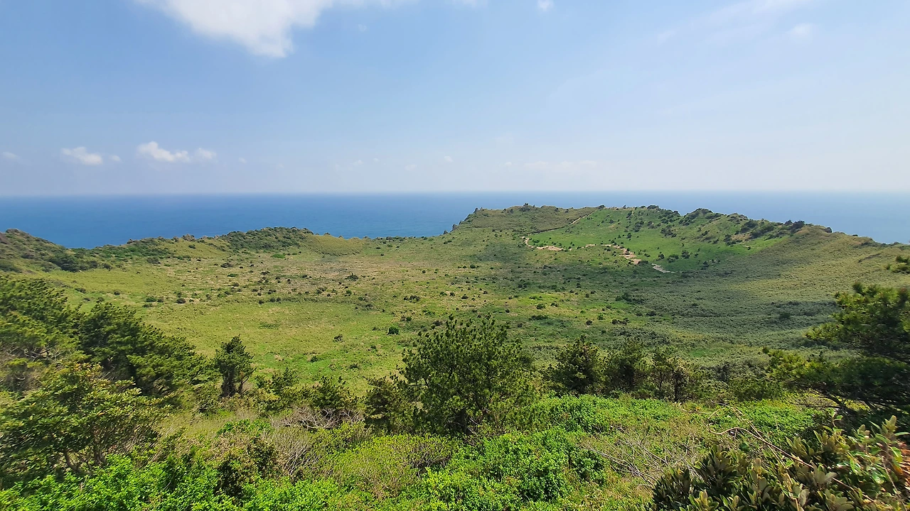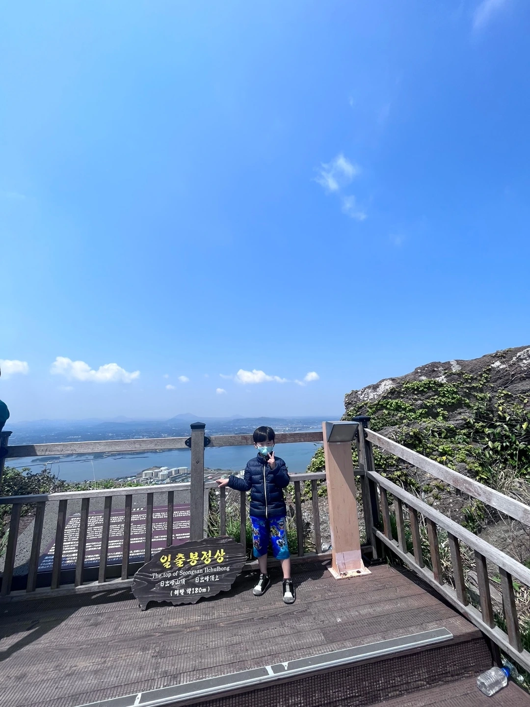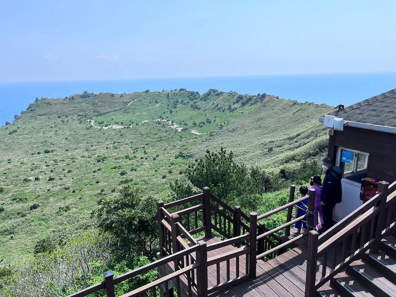 딸과 나보다 먼저 도착한 아내와 아들, 영상통화까지 하며 자기들은 이미 도착했다고 자랑을 한다. 힘을 내어 도착한 성산일출봉, 초록초록빛을 띠고 있는 분화구가 나를 반갑게 맞이한다. 힘겹게 올라온 사람들은 그제야 안도의 한숨을 내쉬며 환한 웃음을 지으며 사진 촬영을 한다. 아들딸 정상 곳곳을 돌아다니더니 분화구 내려가는 길이 막혀있자 내려가고 싶다고 아쉬움을 토로한다. 한참을 왜 못 내려가냐고 나한테 원망을 했다. 하하하하하. 모처럼 우리 가족도 가족사진을 남기고 하산한다.
