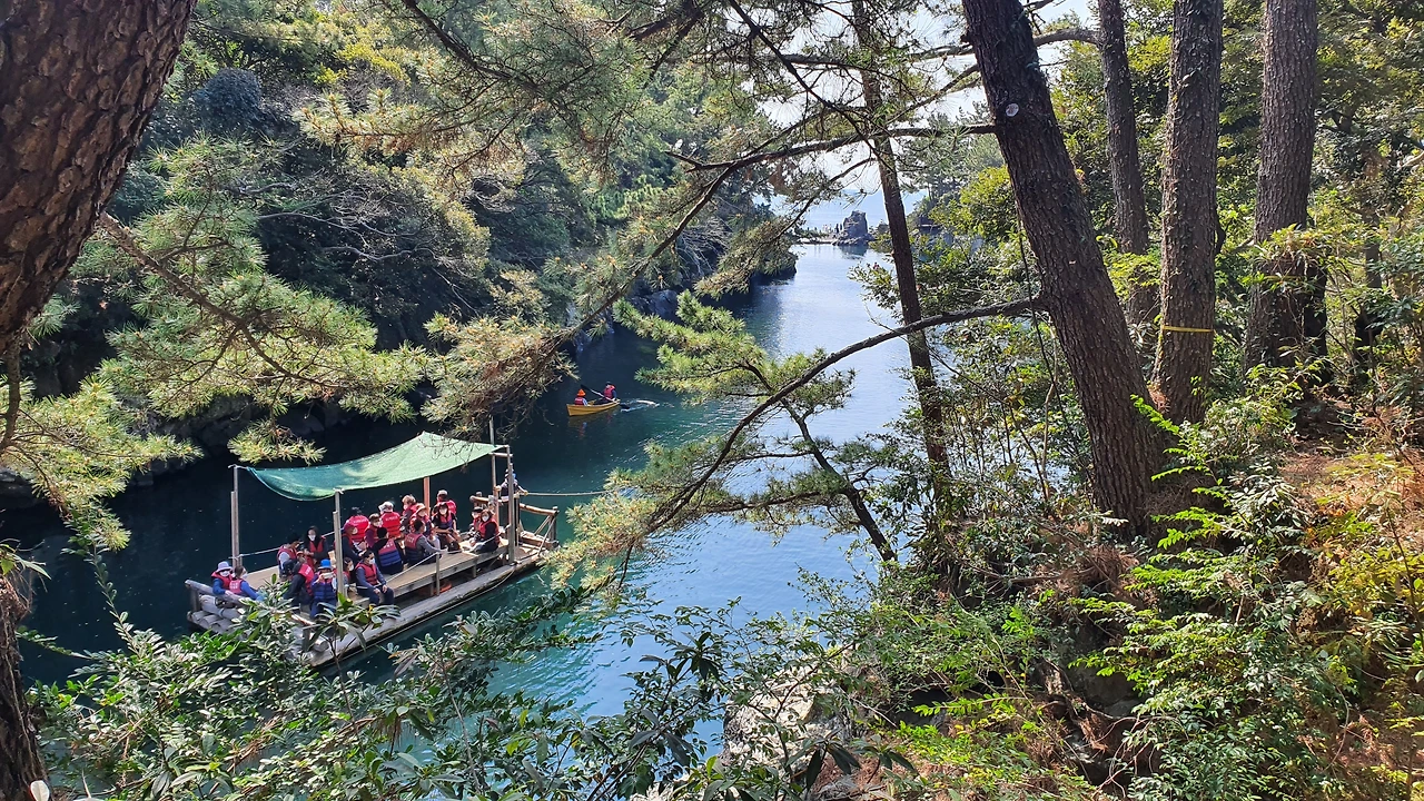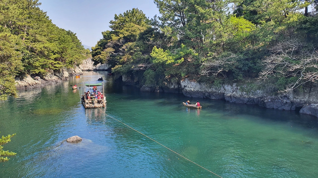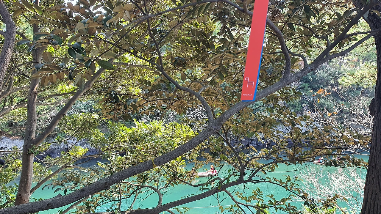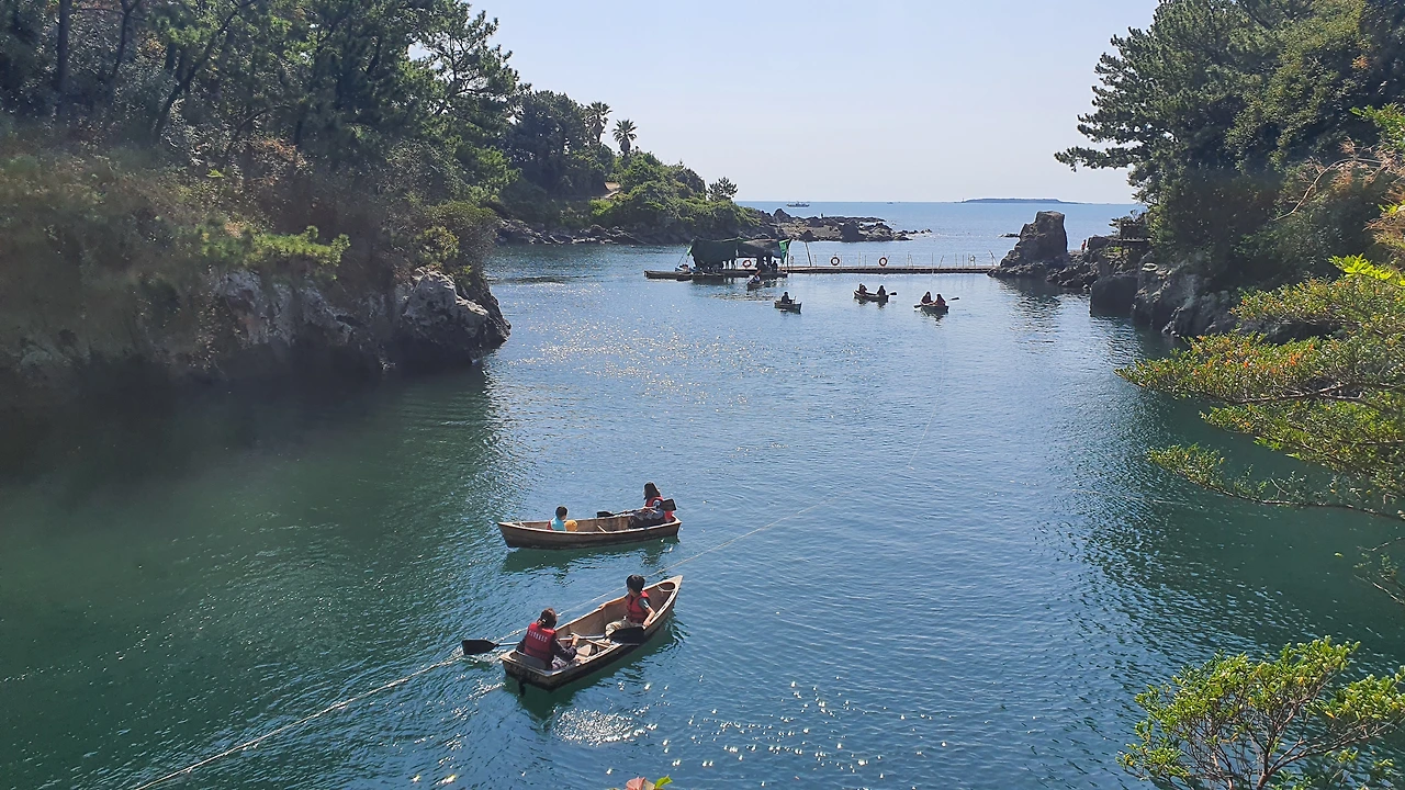 6코스 출발지인 '쇠소깍'은 여전히 푸른 코팔트 색에 관광객을 끊임없이 불러들이고 있었다. 저번에 봤는데 또 봐도 좋다. 테우를 타는 사람들, 카누를 타는 사람들이 이 공간과 찰떡궁합이다. 쇠소깍 코팔트 물만 있었다면 이런 아름다운 풍경이었을까? 아니다. 사람도 풍경이었던 거다. 멋지지만 뭔가 움직임이 없는 무대가 쇠소깍이라면 화려하게 춤추는 배우가 사람들이었던 거다. 그들이 만들어낸 환상 케미가 이 공간을 더 아름답게 만들고 있었던 거다. 사람도 풍경인걸 깨닫는 순간이다.