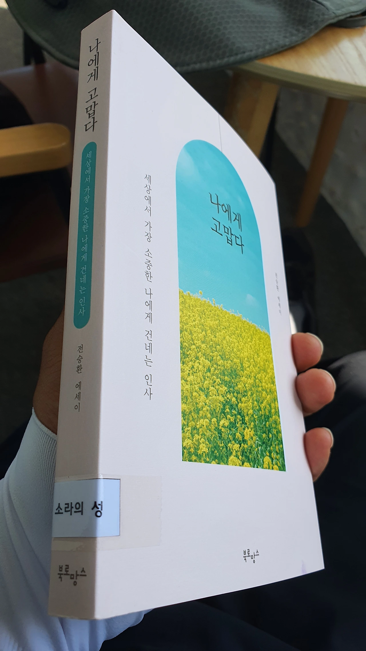 '소정방 폭포'인지도 모르고 봤던 폭포, 정신없이 튀는 물방울이 얼굴 곳곳에 닿는다. 그게 그렇게 또 좋다. 그리고 오늘의 최종 목적지인 '소라의 성'에 도착했다. 목표를 이룬 뿌듯함에 아이처럼 신나게 올레 패스에 도장을 찍는다. 한참을 헤매다 찾은 2층 소라의 성 북카페. 뭐 좀 마시려고 했는데 카페가 아니다. 그냥 진짜 조용히 책 보며 쉬는 곳이다. 카페와 같이 했다면 훨씬 좋을 것 같다는 생각을 했다. 잠시 쉬다 책장에서 책 제목이 끌려 집어 든 책 <나에게 고맙다>. 나를 위한 응원의 메시지가 마음에 든다. 나도 언젠가 책이 나와 이런 북카페에 내 책이 있었으면 정말 좋겠다란 생각이 들었다. 하하하하