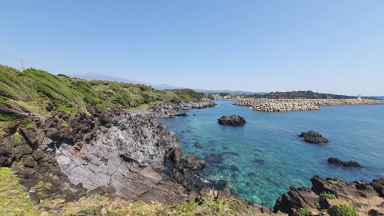 한라산과 기암 절벽과 코팔트 예쁜 바다색을 품은 하효항. by도도쌤