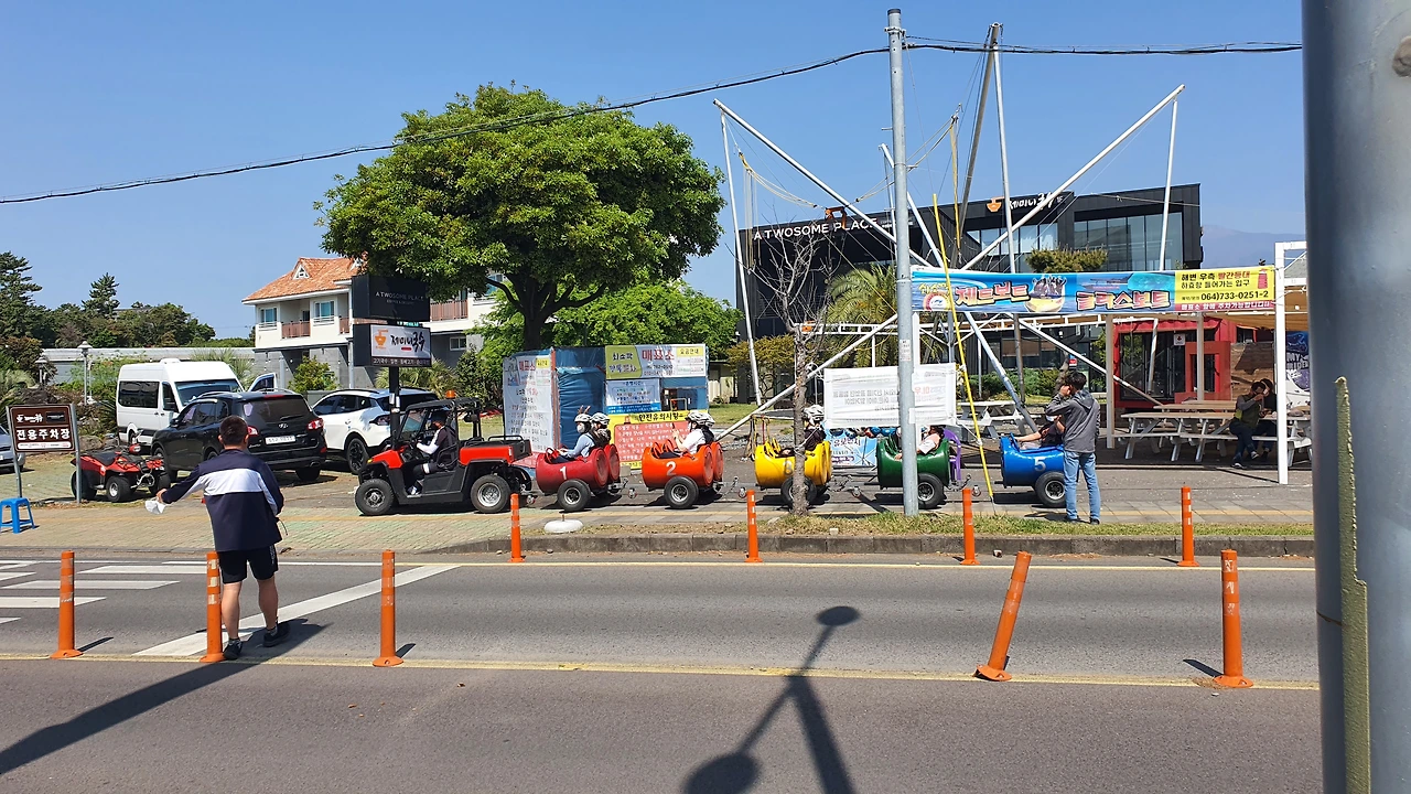 이제 본격적으로 올레길을 걸으려고 하는데, 재미난 놀이기구를 탈 때 나는 그 특유의 즐거운 함성이 들린다. 아이 열차 같은 게 빠르게 길 한 복판을 지그재그로 달리는데 사람들이 소리 지르고 난리다. '깡통 열차'라고 하는데 어른인 내가 다 타고 싶을 정도다. 가격도 얼핏 봤는데 7,000원이다. 다음에 아내랑 같이 오면 꼭 타 보리라 마음먹는다.