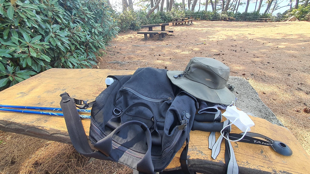 얼마나 걸었는지 모르겠는데 갑자기 피곤이 몰려온다. 딱 하필 그때에 '바닷가 쉼터'라는 곳을 만난다. 가방과 스틱만 내려놓았는데 날아갈 것 같다. 그리고 모자와 마스크까지 벗으니 집에 온 것 같이 편안하다. 그 편안함에 나도 모르게 의자에 누워 한숨까지 잤다. 쉼터에서 제대로 쉬었다. 하하하하하.