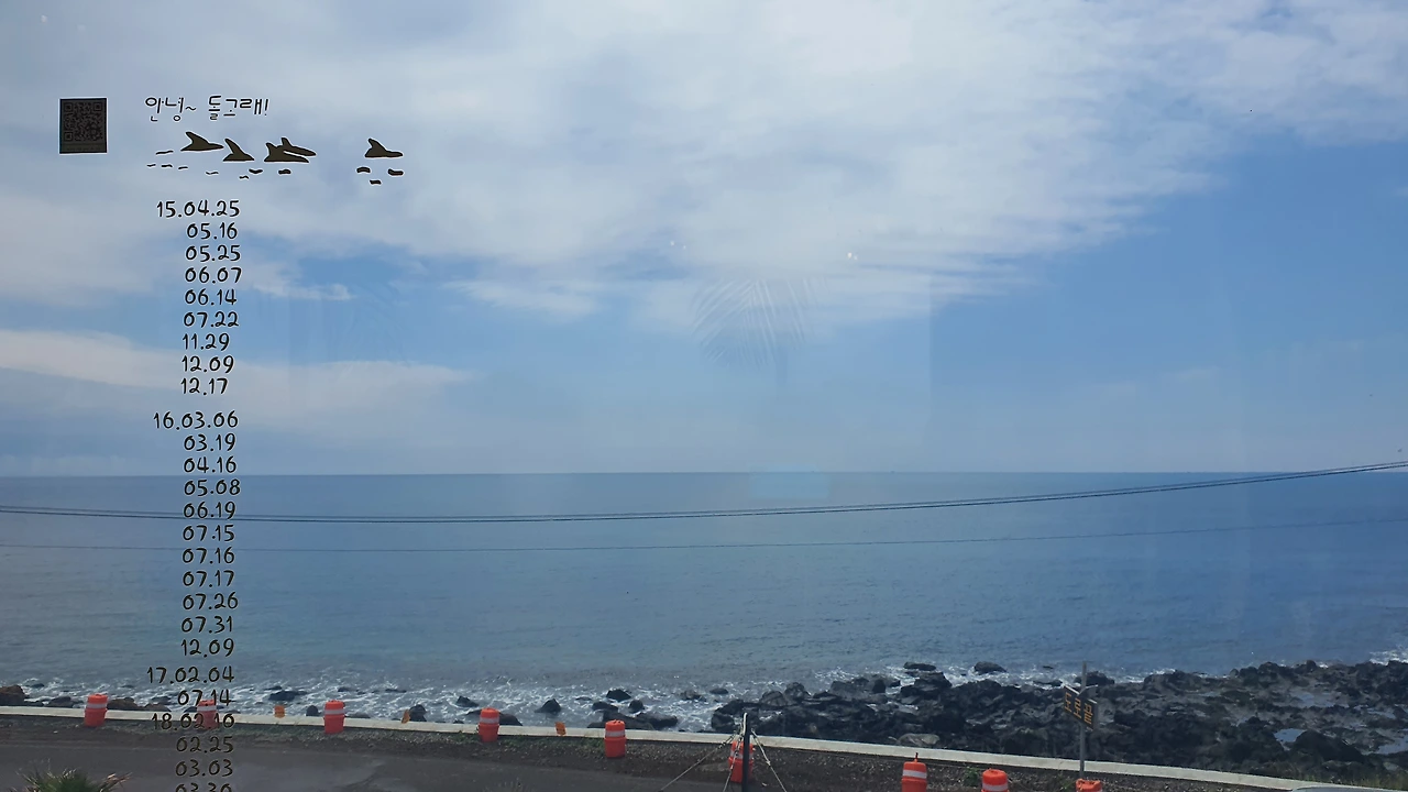 돌고래가 보였던 년도와 날짜가 창문에 적혀있다. 아내랑 나 돌고래가 혹시 보일라 파란 바다를 그렇게 쳐다본다. 하도 궁금해 "돌고래 진짜 보여요?"라고 주인에게 물어봤더니, "돌고래가 보이면 요 앞에 해안선을 따라 가요."그런다. 그 말에 아내와 나 둘이서 돌고래 찾아보려고 또 열심히 파란 바다를 그렇게 쳐다본다.고깃배만 저 멀리 둥둥 떠 다닌다. 하하하하하.