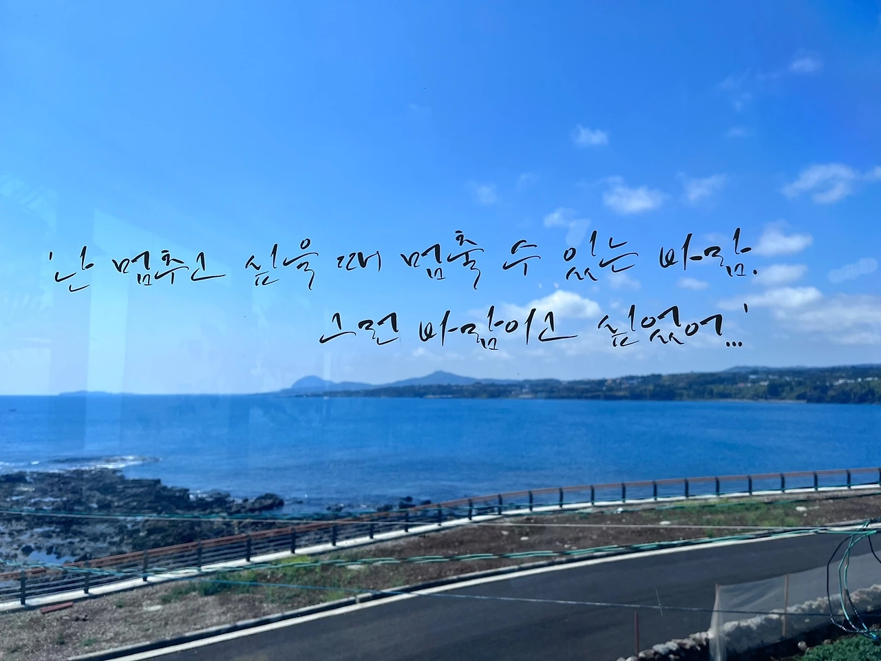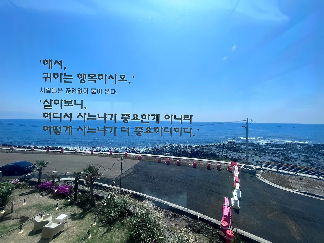 친구가 소개해 준 카페다. 올레 7코스 도로 끝 오른쪽에 위치한 2층짜리 아담한 카페다. 여기 카페 시그니쳐 메뉴인 밀크티와 아인슈페너 한 잔을 시켜 2층으로 올라갔다. 비가 그쳐 갠 바다와 하늘 풍경이 유리창에 적힌 문구와 절묘하게 어울린다. 폰을 안 들으려야 안 들 수가 없다. 찰칵찰칵찰칵 글귀를 풍경에 맞추어 열심히 찍는다.