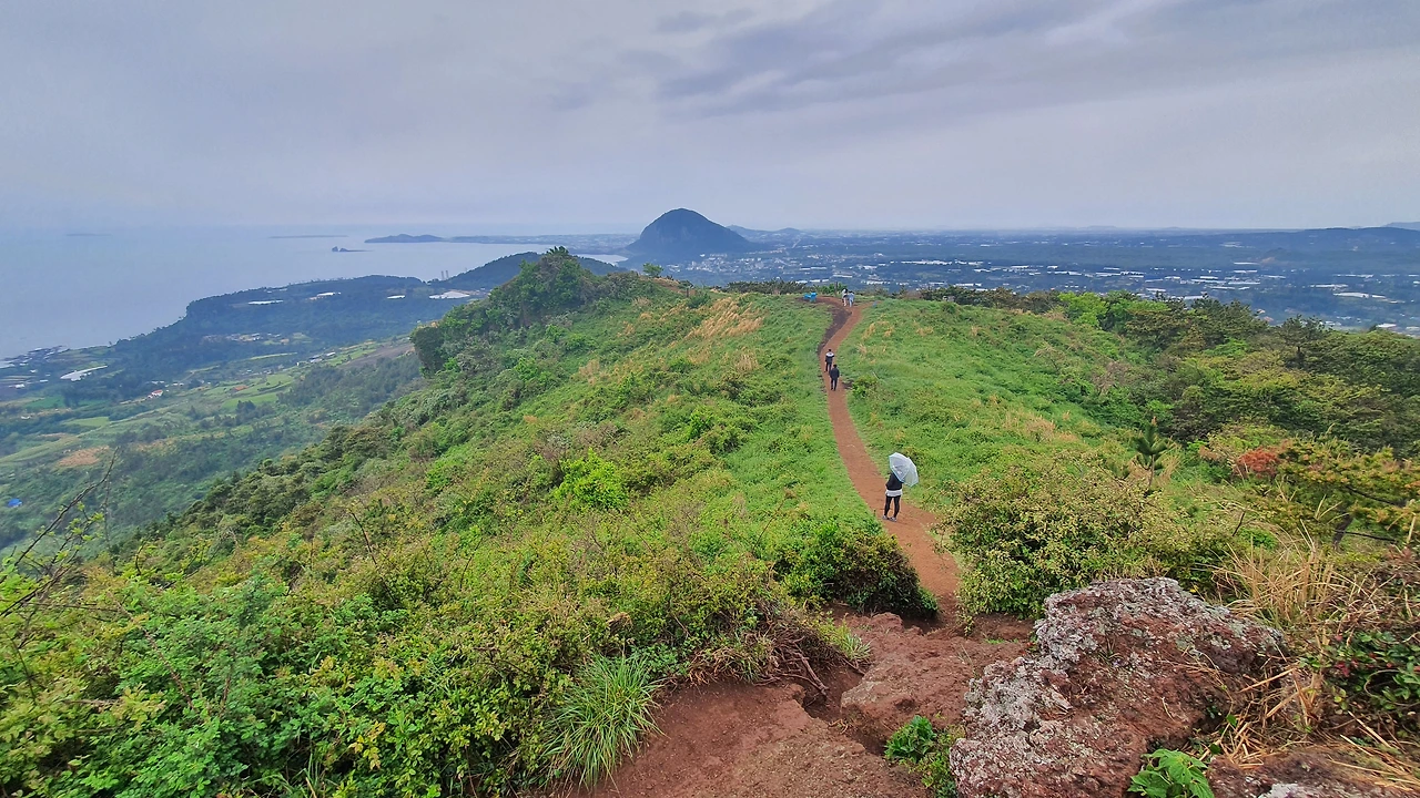 올랐다 뒤돌아 보고 '우와!', 다시 조금 올랐다 뒤돌아 보고 다시 '우와', 그러다 정상에 오른 순간 입이 다물어지지가 않는다. 친구가 추천해 준 이유가 다 있었다. 360도 올라운드 뷰다. 제주도 전체가 한눈에 쏙 들어온다. 경치에 압도되어 그 자리에서 몇 번이나 뺑뺑 돌았는지 모르겠다.