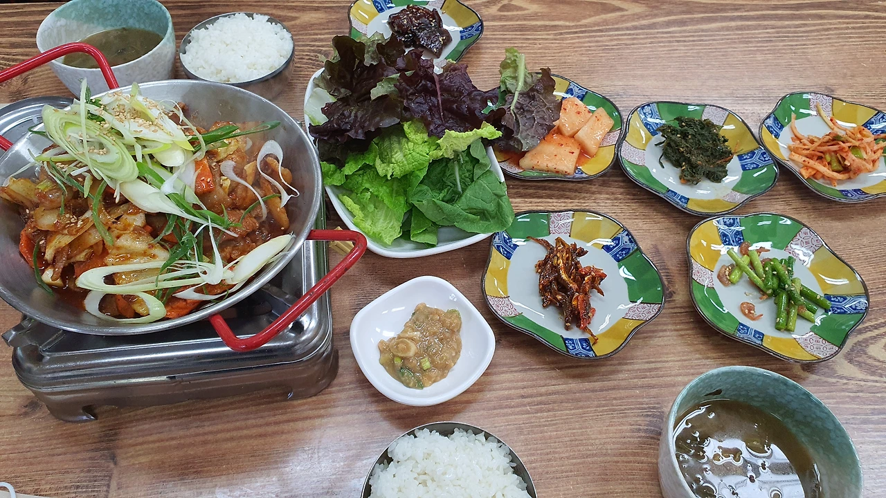 그리고 곧이어 나온 오늘의 주인공 불백. 보글보글 끓는 달콤한 돼지 불백 향이 코를 자극한다. 상추 위에 고기 두 점과 파를 올려 먹었는데 황홀하다. 메뉴 바꾼 건 신의 한 수였다. 전혀 기대 없이 온 식당인데 속으로 몇 번이나 심봤다 했다. 아내도 한 입 싸 먹더니 눈이 똥그래졌다. 광치기 해변에서 먹은 '고등어 쌈밥'과 신상공원 근처인 '돼지구이연구소' 맛에 버금가는 최고의 맛이었다. 상추 리필에 초록 나물 리필에 불백 고기가 순식간에 사라졌다. 5점 만점에 4.9점이다. 가격 빼곤 할 말이 없다.