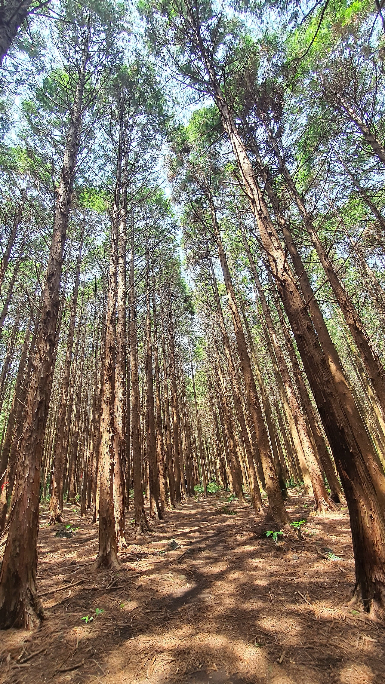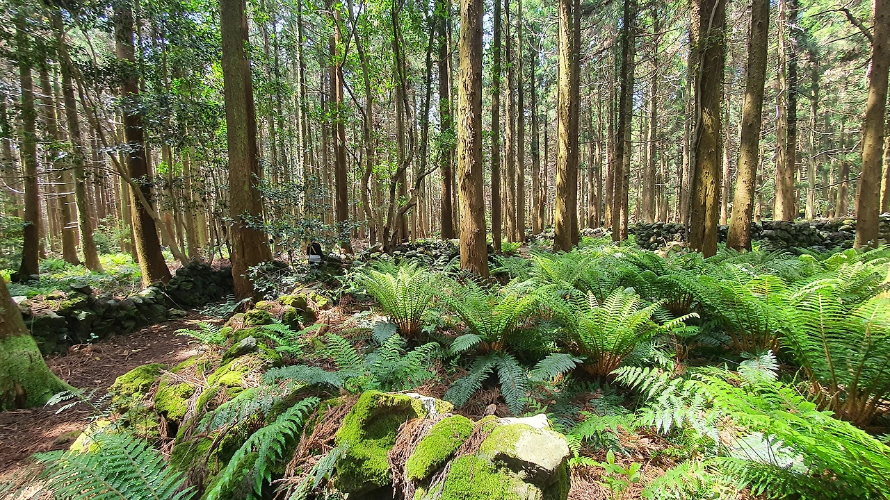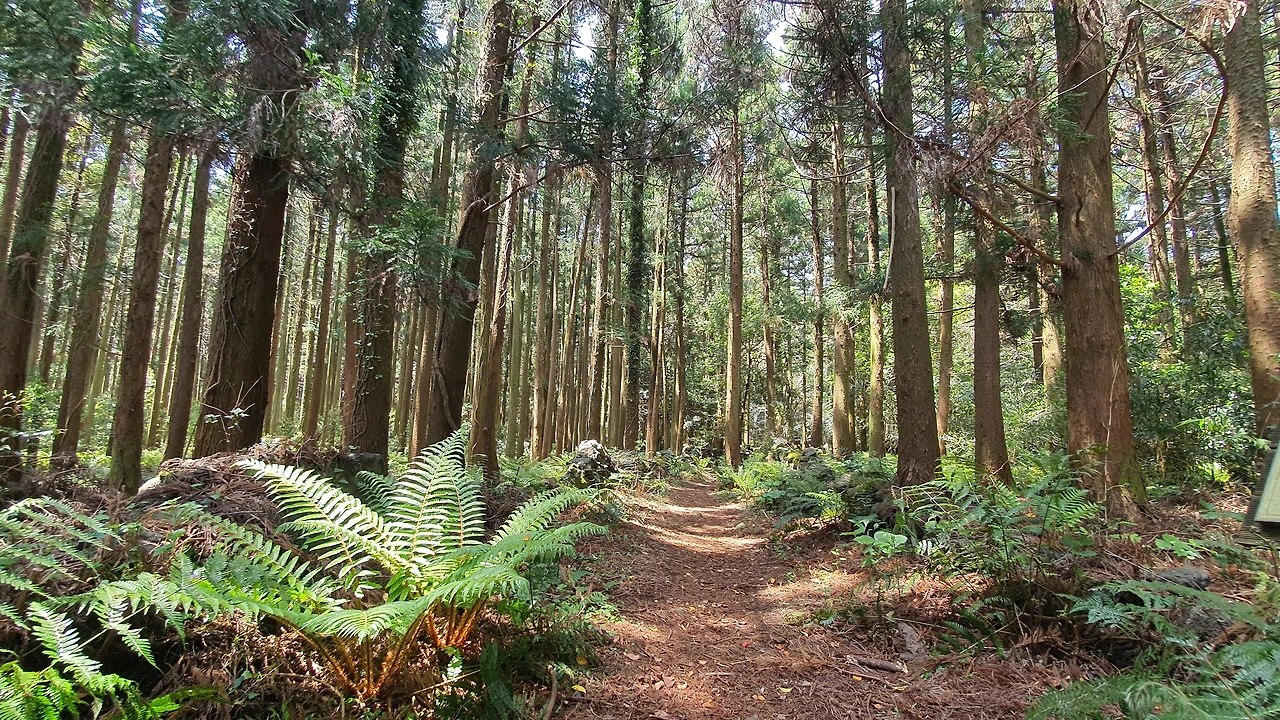 웃다가 보니 관중(고사리) 군락지 쇼가 펼쳐진다. 세상에나 초록 연두 관중 식물과 빼곡히 하늘로 솟은 삼나무들의 조합이 환상적이다. 이건 뭐 영화의 한 장면 속으로 풍덩 빠져 든 기분이다. 머체왓 숲길의 최고 아름다운 순간이아니었나 생각한다.