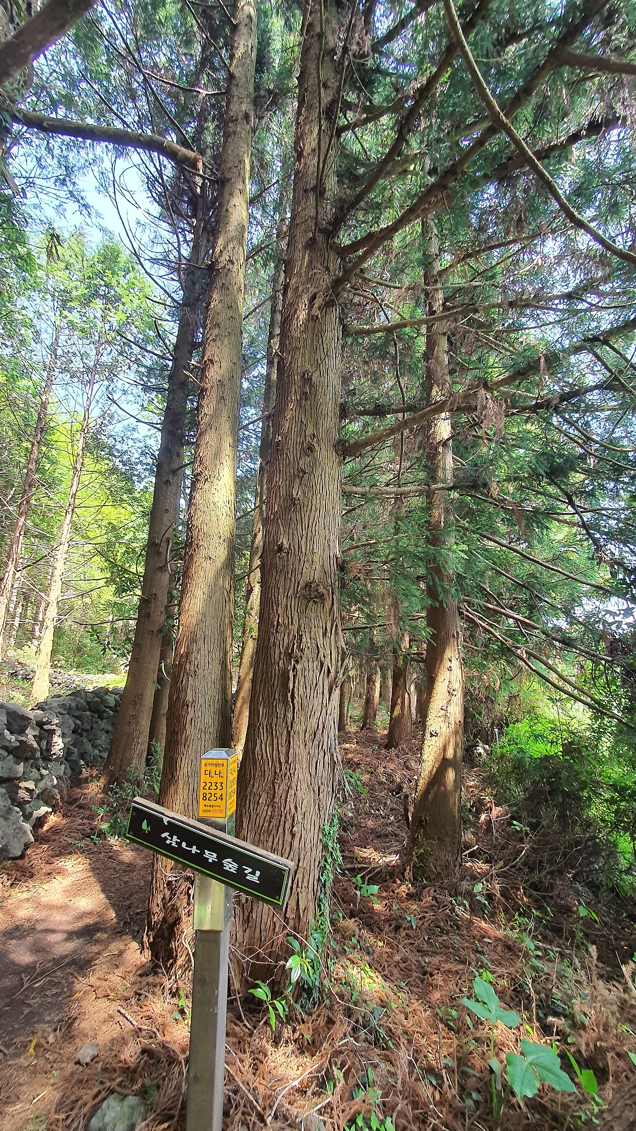 이곳부터 줄줄이 머체왓 숲길의 아름다움이 펼쳐진다. 편백향이 솔솔 풍기는 편백나무 숲길을 지나 하늘 높이 솟은 삼나무 숲길이 가는 발걸음을 가볍게 한다. 말이 임신 중이니 조용히 지나가라는 표지판을 보고는 발소리도 조심조심 걷는다. 그런데 말도 안 보이고사람도 아무도 없고 우리 밖에 없다. 사람이 없는 이유를 '고사리' 때문이라고 추측한다.