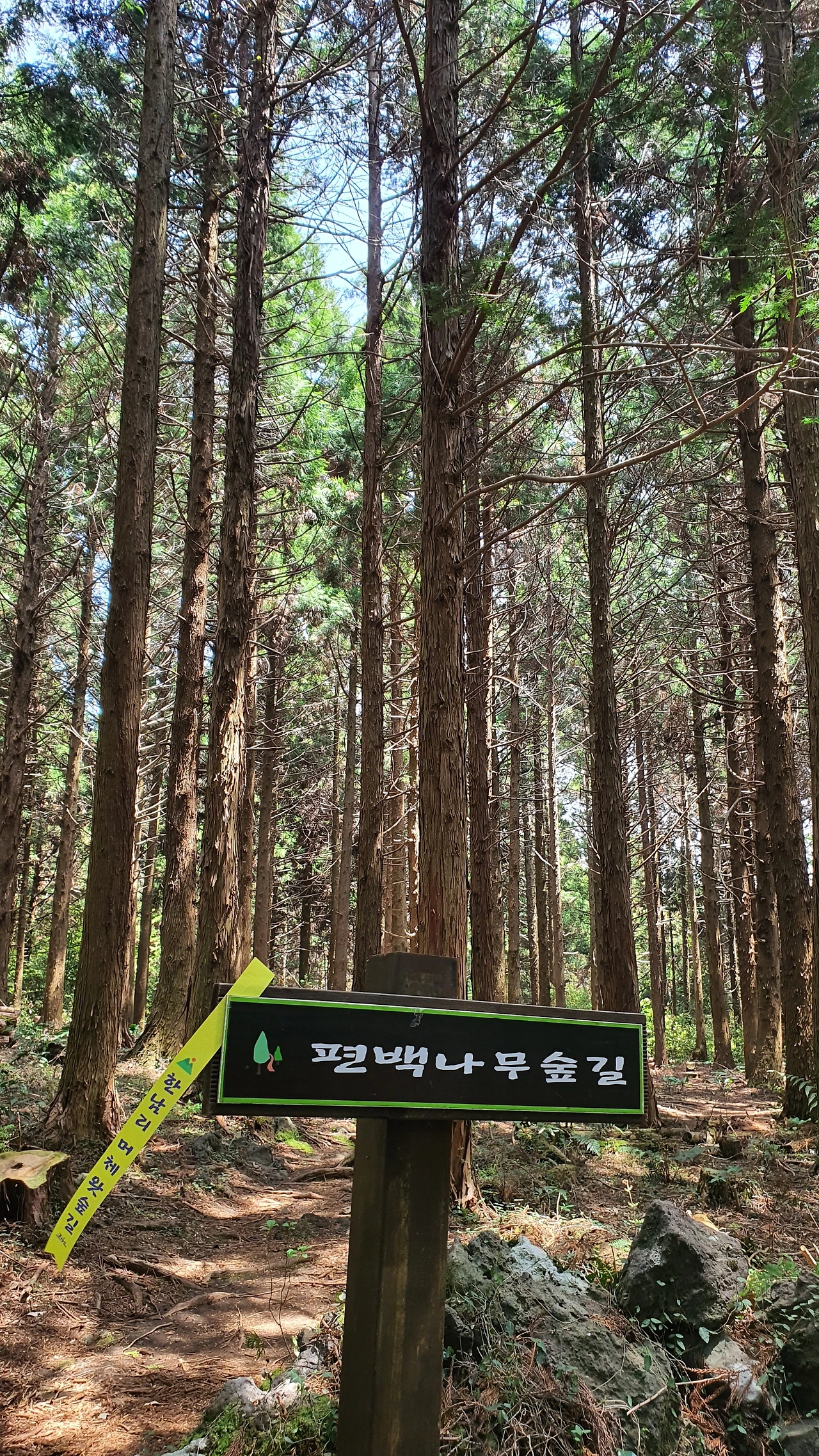 갈랫길이 헷갈려 들어선 이곳, 편백나무가 빼곡하여 편백향이 코를 찌를 정도로 향기롭다. 그런데 뭔가 이상하다. 나무에 매달린 노란 안내 리본은 안 보이고 빨간 리본만 나무에 둘러져 있다. 그 빨간 리본을 따라갔는데 숲길은 안 나오고 가도 가도 똑같은 풍경이다. 게다가 휴대폰도 안 터진다.