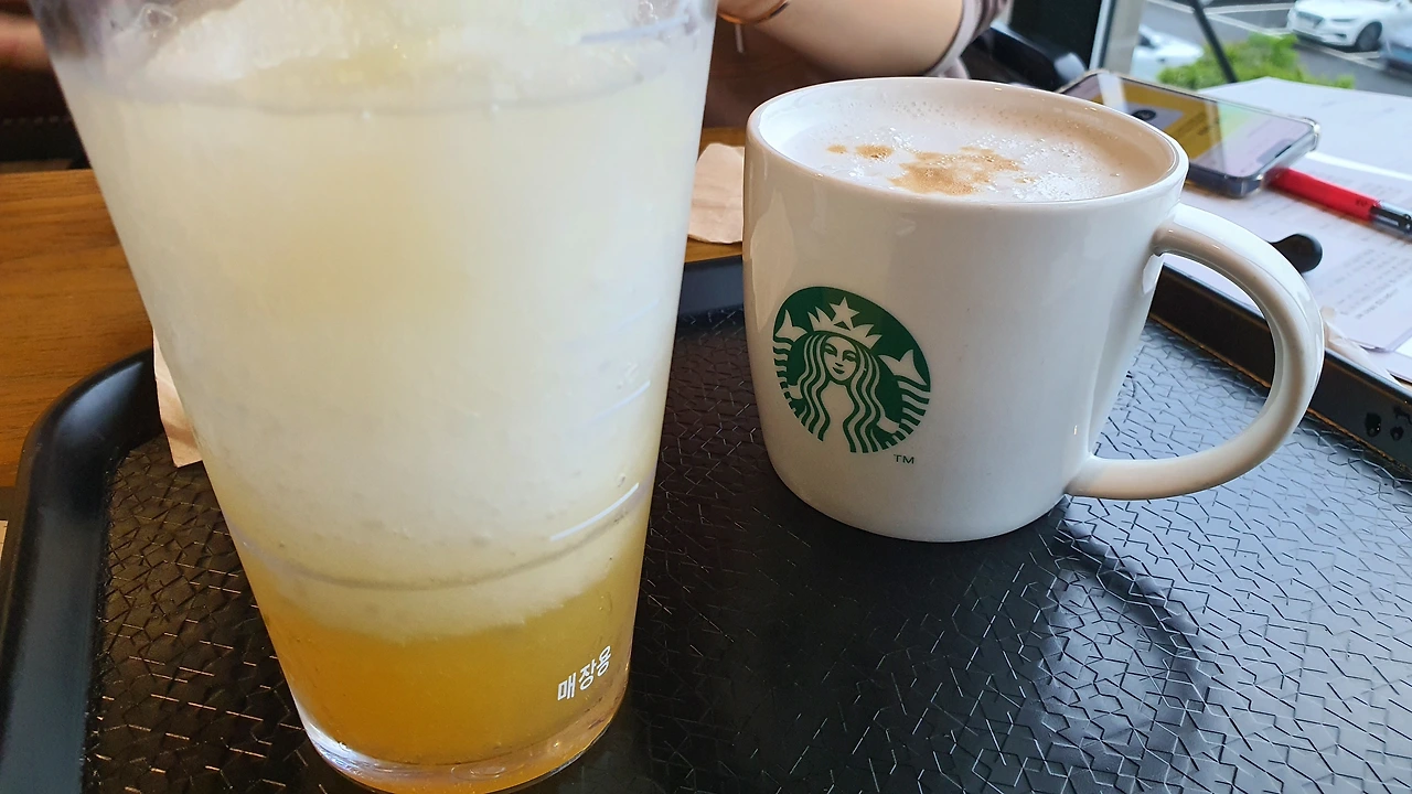 비 오는 평일 오전인데 사람이 꽤 있다. 아내 말로는 이 정도는 없는 편에 속하는 거란다. 아무튼 별다방 이곳은 한국 어디를 가도 사람이 꾸준히 많다. 커피를 안 먹는 나에겐 인류 최대의 미스터리가 아닐 수 없다. 하하하하. 아내는 커피 한잔을 시키고 내겐 제주에서만 먹을 수 있는 음료 몇 개를 추천한다. 쑥머시기 차를 먹으려다 아내가 추천하는 '제주 한라봉 모히또 블랜디드'라는 걸 시켰다. 이것도 뭣이 이렇게 이름이 긴지. '모히또'라고 하니 영화 '내부자들'에서 이병헌이 말한 모히또가 생각났다. 하하하