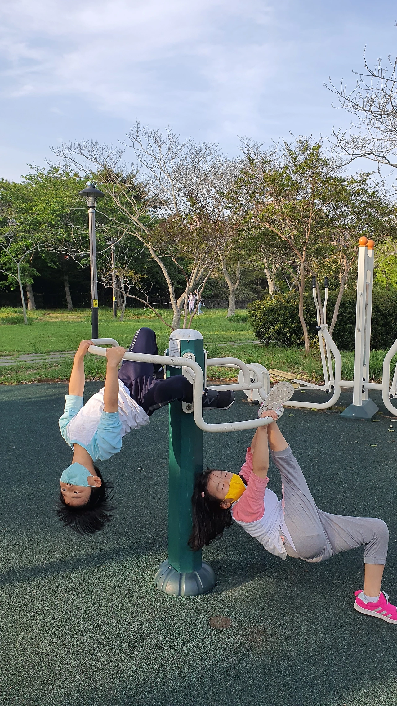오늘은 새롭게 놀이터 앞에 운동기구도 발견했다. 운동기구가 종류별로 정말 많다. 아내 이만보를 채워야 한다면서 팔을 사정없이 올렸다 내렸다 파워워킹까지 하며 아주 열심히 한다. 아이들도 엄마 아빠가 그렇게 열심히 하니 저희들도 걸음 수 나오는 손목시계를 달라고 한다. 아들딸 하나씩 결국 채워주었다.