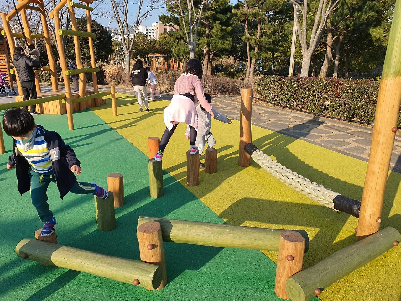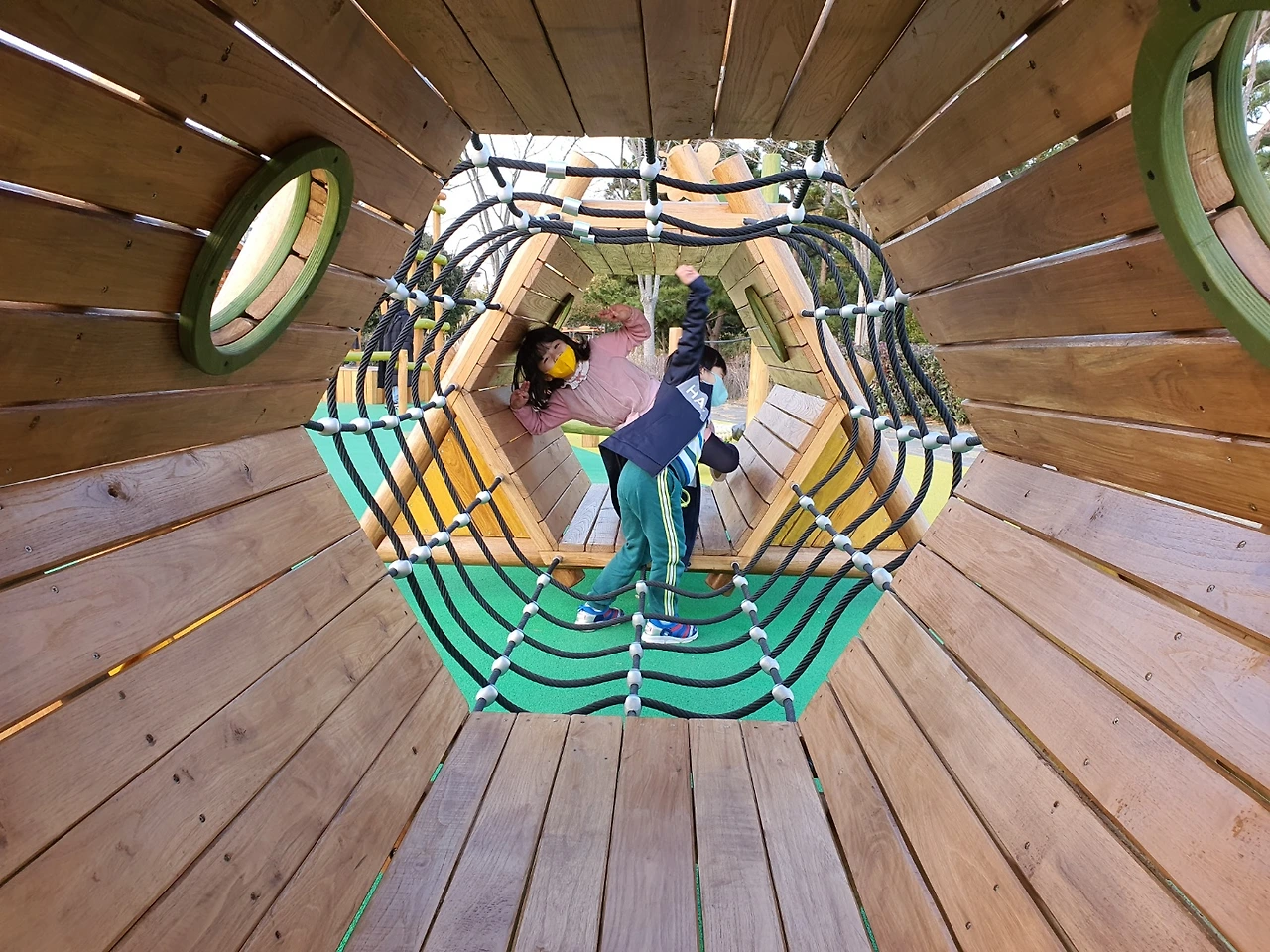 육각형 나무 통이 두 개 그물로 연결된 놀이기구다. 여기 위로 올라갔다가 내려왔다가 하는 걸 둘 다 그렇게 또 좋아라 한다. 나도 사실 여기 육각형 나무 안에서 쉴 때가 참 좋다. 사람이 없을 땐 그냥 대자로 누워 있는다. 하하하하. 오르락내리락하면서 낚시 놀이도 하고 점프도 하고 줄타기도 하고 참 다양하게 잘 논다.
