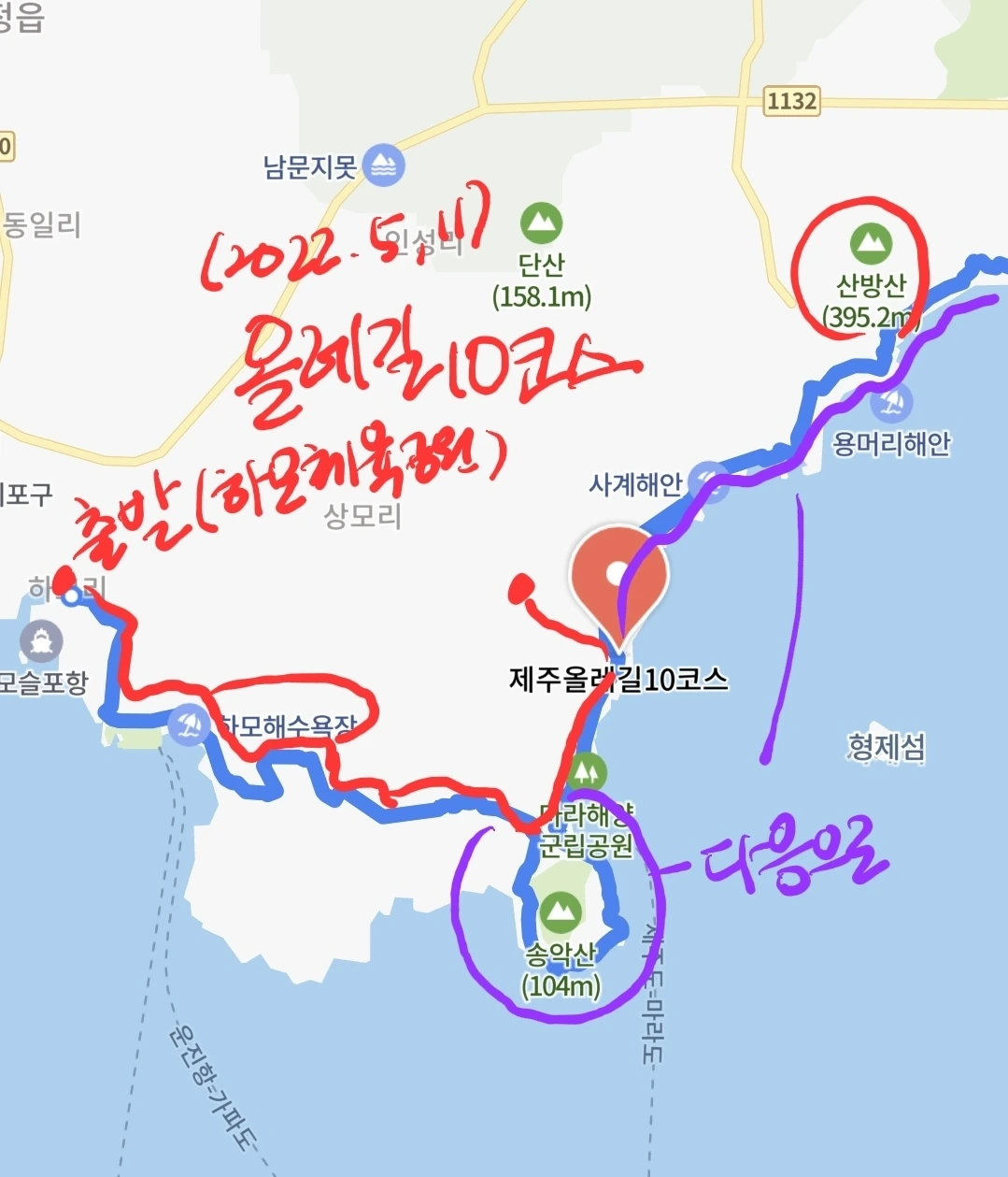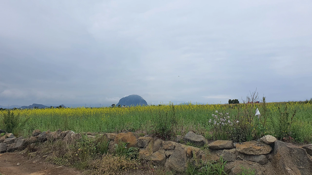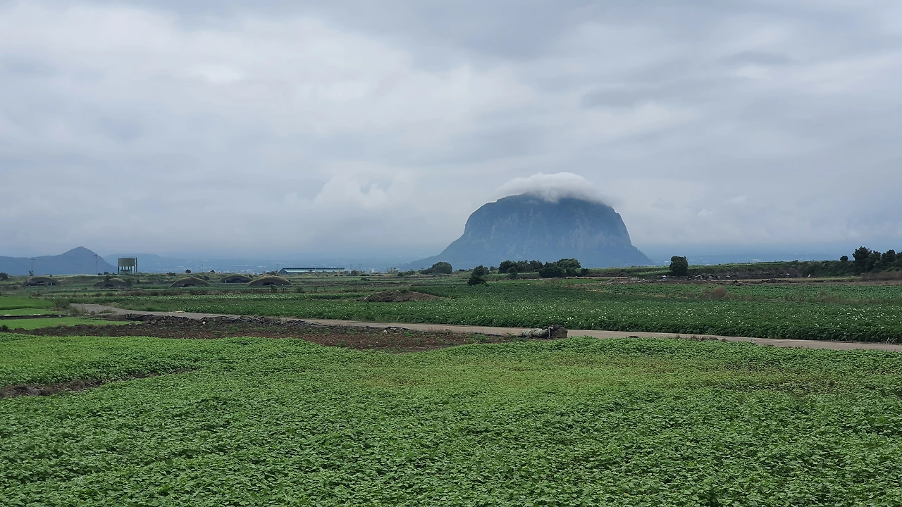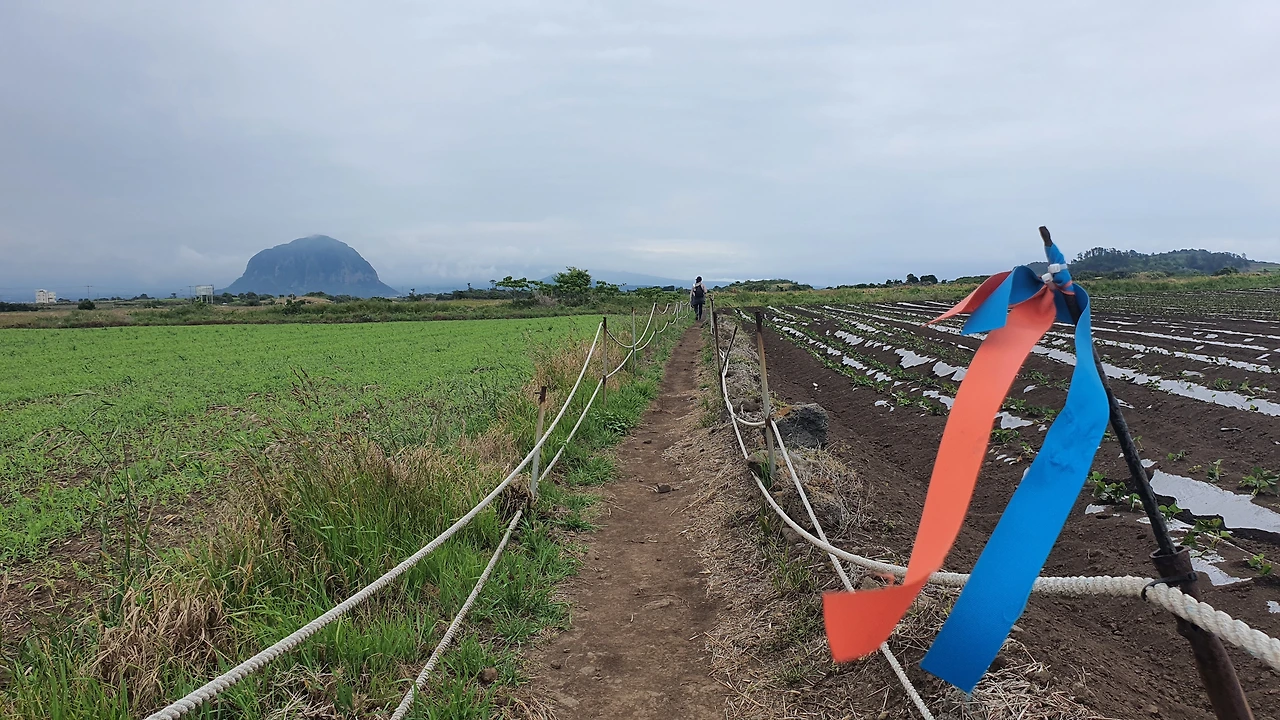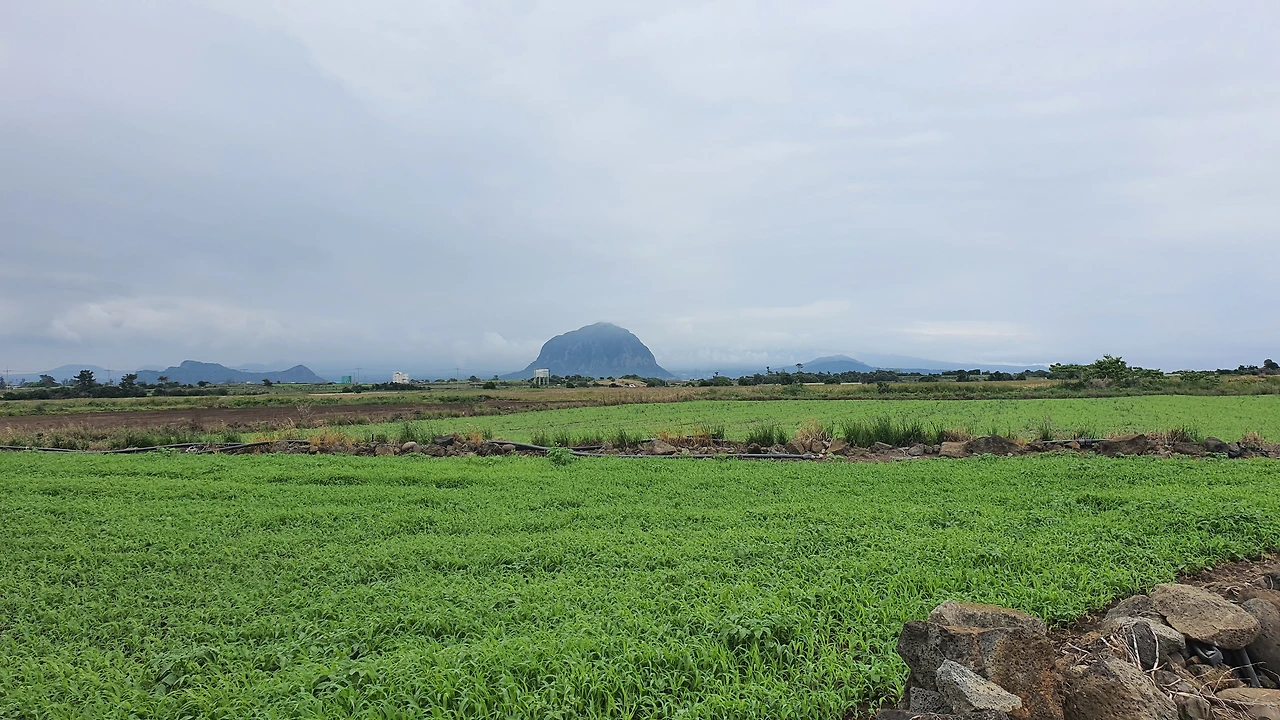 거꾸로 걷는 올레길 10코스, 비가 막 그쳐서 그런지 공기도 깨끗하고, 바람도 솔솔 불어오고, 뜨거운 해도 없어 걷기엔 안성맞춤이지 뭐야. 아기자기한 하모해변길을 끝으로 도로를 건너자, 넓은 들판 끝에 산방산 네가 우뚝 보이는데 얼마나 또 반가운지 몰랐어.