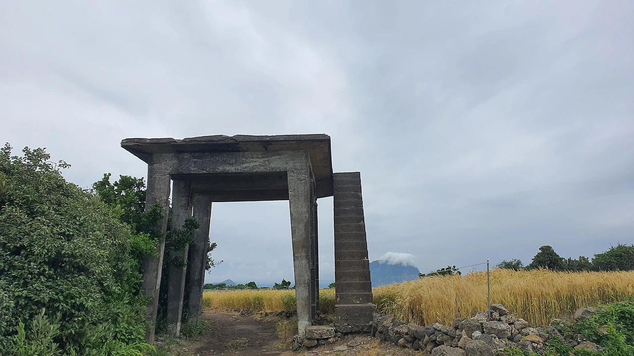 일본이 만든 알뜨르 비행장 지하 벙커 속을 나와 산방산 너를 다시 보는데 내 마음이 다시 울컥했어. 이 아름다운 곳에 지하벙커와 수십 개의 비행기 격납고는 웬 말이냐? 그리고 관제탑이라고 하는 시멘트 사각기둥과 네가 겹쳐 있는 풍경을 보니 역사의 아픈 현장 속으로 순간 빨려 들어간 듯했어.