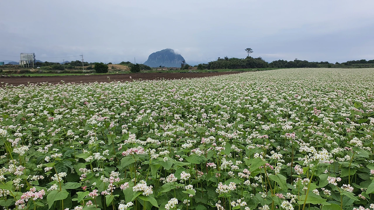 올레길 리본과 함께 너를 찍고, 노랑 하양 감자꽃과 함께 또 찍고, 황금보리와 함께, 걷고 있는 아내랑, 그리고 태어나서 처음 만나본 메밀꽃과 함께 너를 찍었어. 사진들이 온통 산방산 너와 함께한 사진밖에 없네. 우리 아내가 질투를 할 만큼 너 사진이 아내 사진보다 훨씬 많구나.