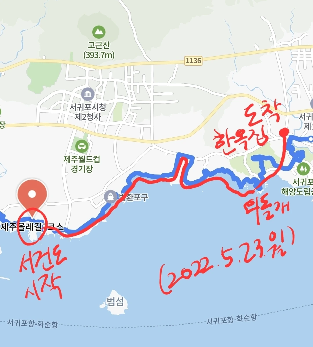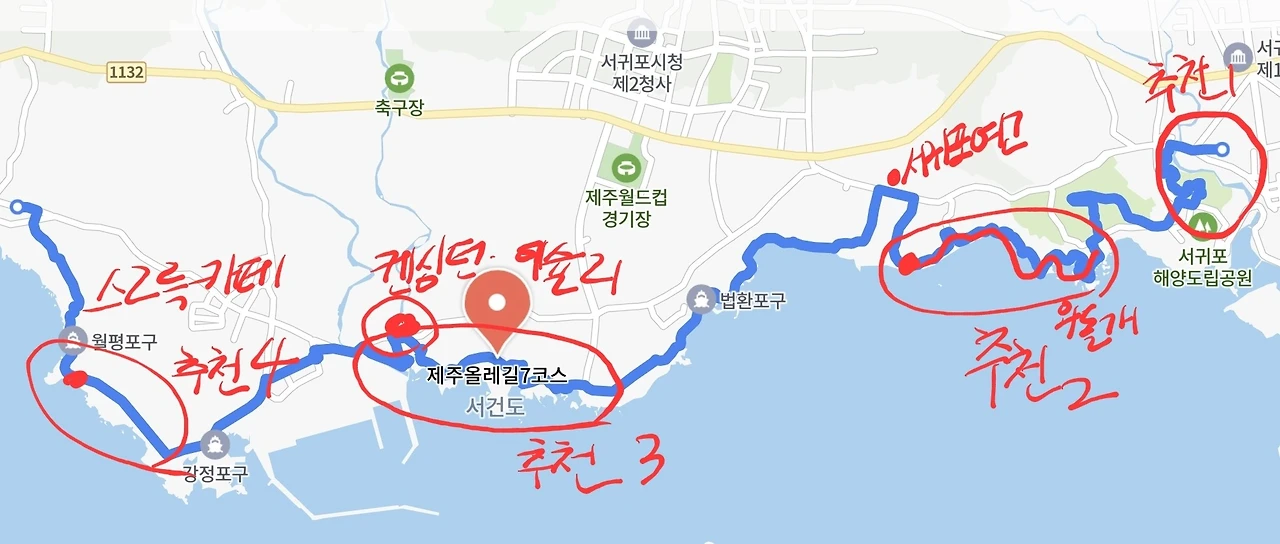 완벽하게 올레길 7코스를 다 걸은 셈이다. 올레길 센터에서 시작해서 칠십리 시공원, 외돌개, 법환포구와 서건도. 그리고 강정천을 지나 월평 아왜낭목까지. 끊어진 길을 이었더니 마음이 편하다. 올레 7코스는 개인적으로 한 번에 가기엔 너무 무리다. 만일 두 코스로 나눈다면 이렇게 걸을 것 같다.