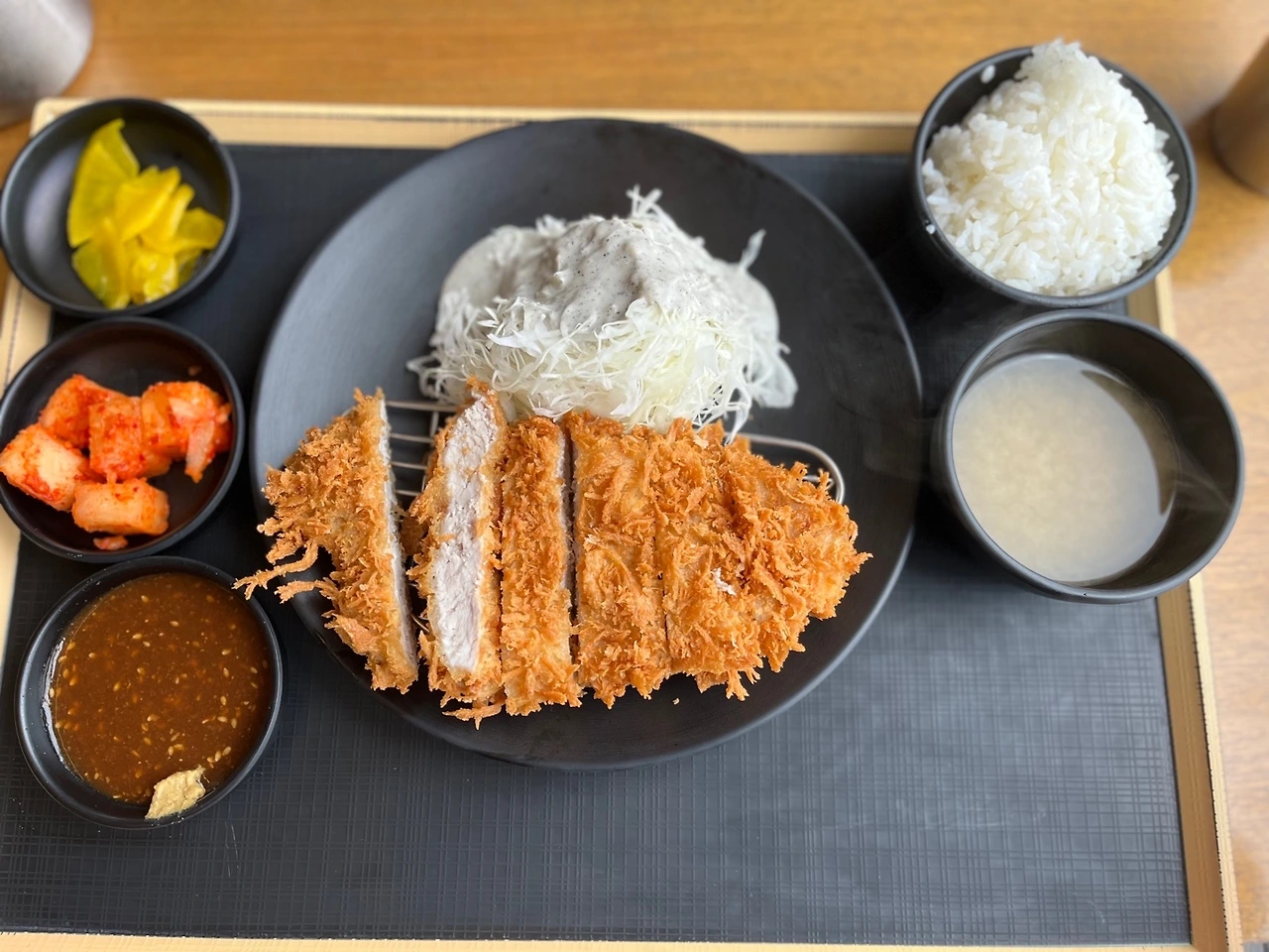 드디어, 나온 등심 돈가스. 돈가스 가게에서 먹어본 돈가스랑 비주얼이 다를 게 하나도 없다. 먹는 방법대로 순서대로 한 번 먹어본다. 등심 한 조각을 집어 그대로 씹어보는데 '음... 부드럽네. 튀김이 아삭아삭하네.' 요정도다. 그렇게 맛있는지 잘 모르겠다. 하하하. 소금도 뿌려서 먹었는데 '짭짤하네. 부드럽네' 딱 요정도다. 그럼 이번엔 겨자가 살짝 들어간 소스다. 역시 돈가스는 소스랑 제일 잘 어울린다. '맛있다!' 그럼 돈 내고 따로 시킨 카레랑 조합은? 역시나 돈값한다. '부드럽고 은은한 카레향이 입에 쏵 퍼진다.'