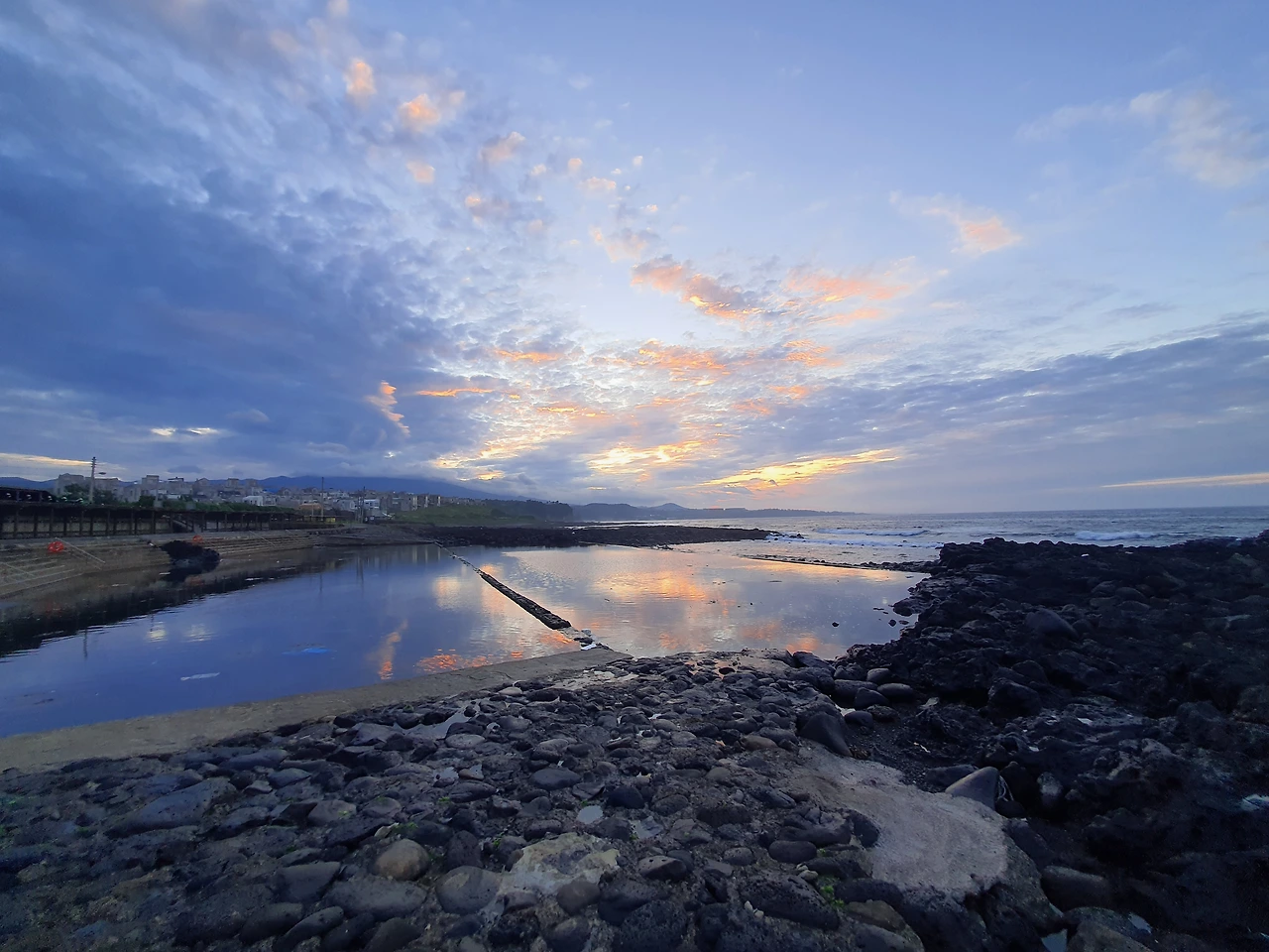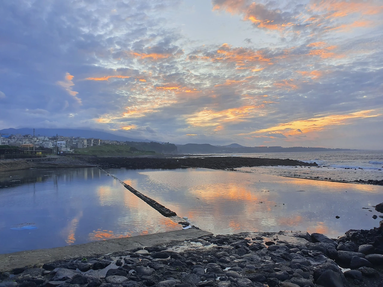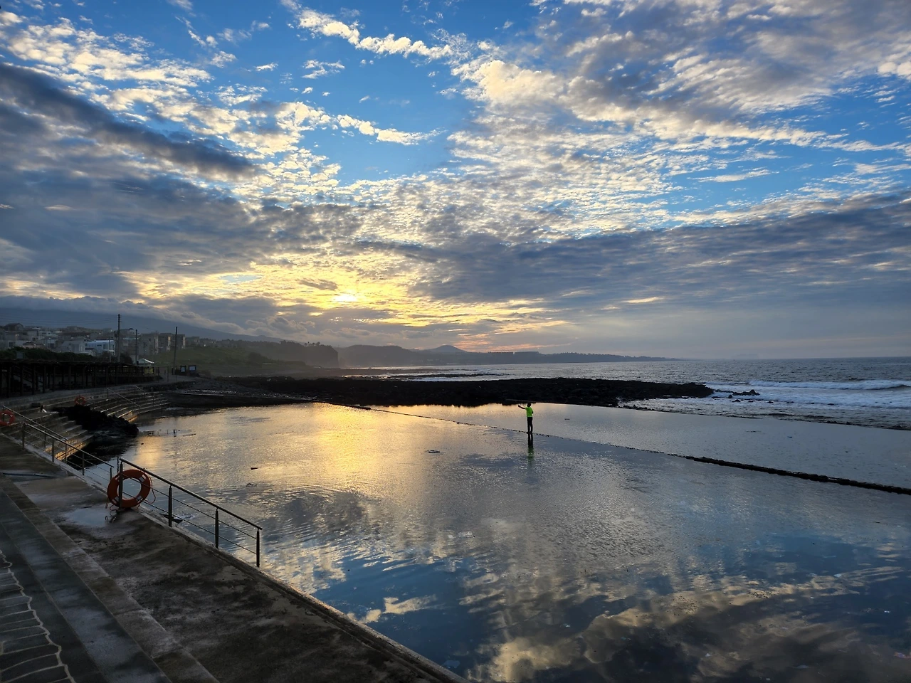 저 멀리 색달 해안가와 이름 모를 절벽엔 물안개가 피어오르고, 주홍 태양빛에 하늘과 구름이 열린다. 그림이 따로 없다. 그 그림들이 논짓물 물에 반사되어 또 다른 그림이 물속에서 살아난다. 이 아침 제주 풍경을 보기 위해 캠핑을 했나 싶을 정도로 기대 이상의 장관이다. 친구 녀석도 뭉게뭉게 춤추는 구름이 신기한지 계속 하늘 멍이다.