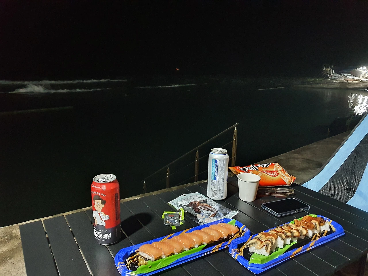 텐트에 누웠다. 여름 밤바다라 혹시나 추울 줄 알았는데 텐트 안이 따뜻하다. 옆 텐트 속 아저씨 코 고는 소리와 파도 소리가 뒤섞여 이 밤이 시끄럽다.잠이 스르륵 온다.....