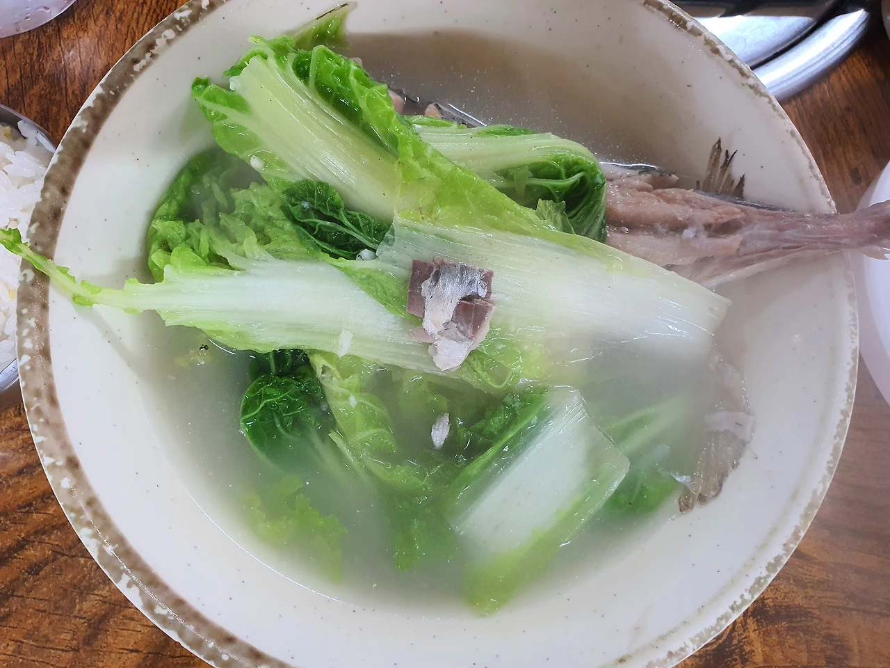 "여기, 각재기국 하나 주세요." 하며 나도 덩달아 기분 좋게 음식을 주문했다. 그리고 이어 나온 각재기국. 신선한 초록 배춧잎에 물고기 한 마리가 다다