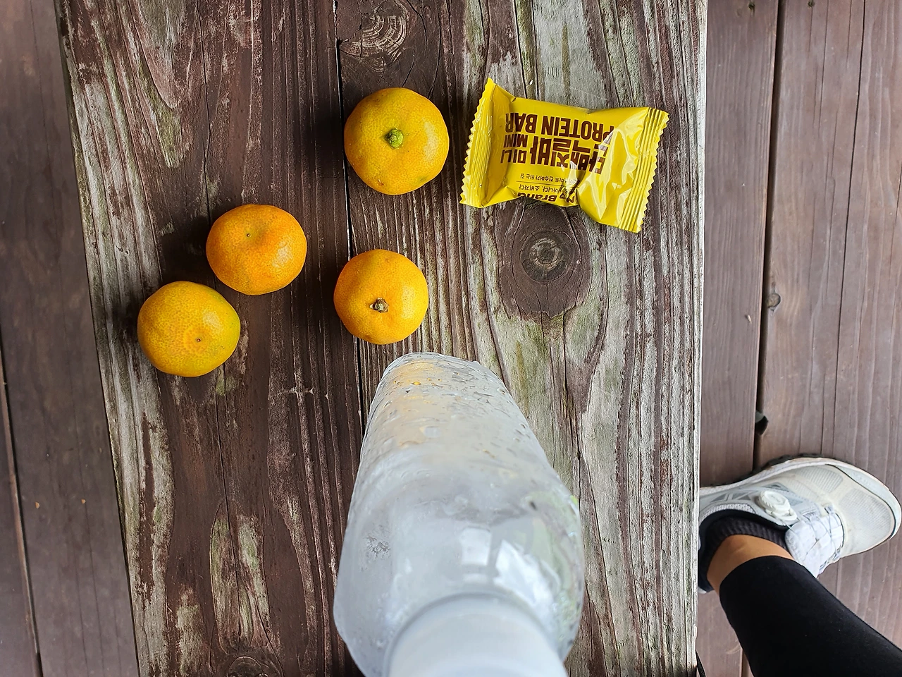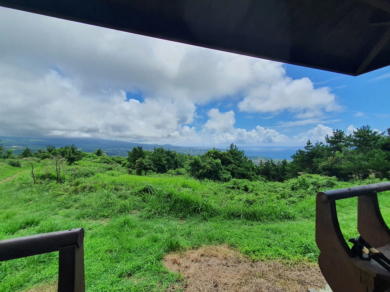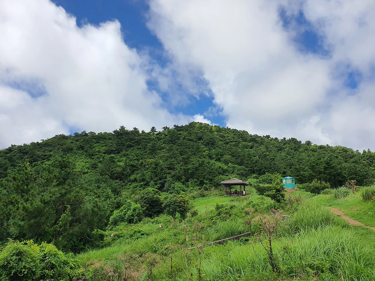 내려가는 길, 쉼터에서 잠시 쉰다. 귤이 입속에서 달달하다. 에너지 바에 지친 영혼이 돌아온다. 파아란 하늘 속 하얀 뭉게구름과 초록 나무를 바라보니 부러울 게 하나도 없다. 제주가 마냥 좋다.