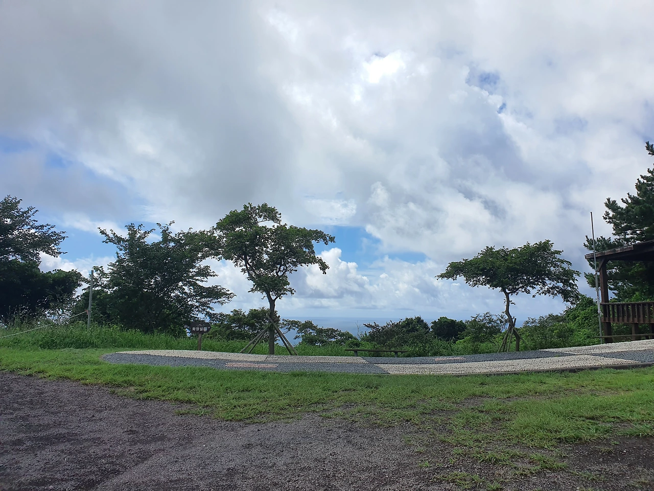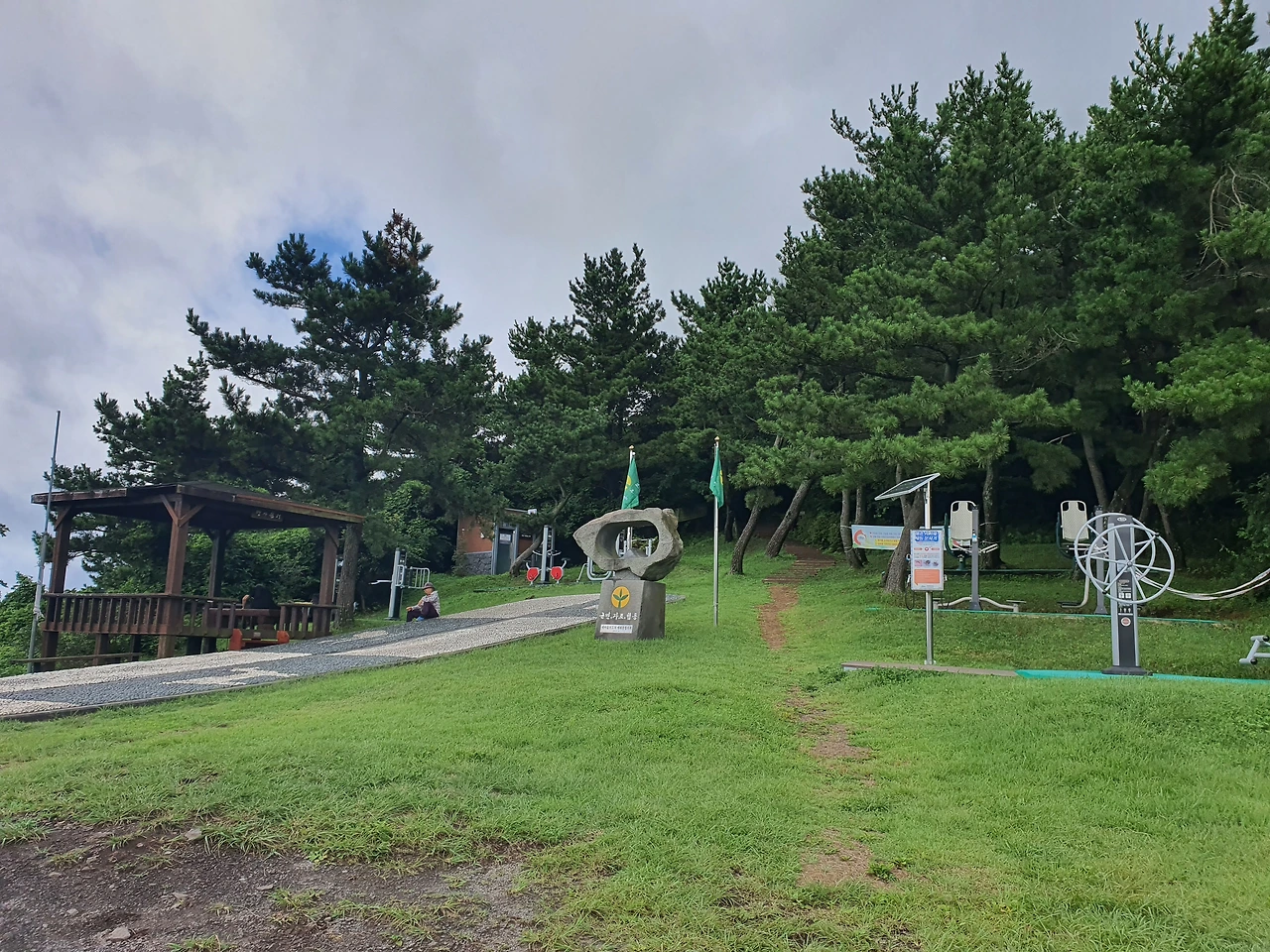 좁은 마을 길을 따라 길 안내를 한다. 구불구불 올라가니 군산 산책로에 금방 다다른다. 동네 뒷산을 방불케 할 만한 아담한 운동기구와 쉼터가 우릴 반긴다. 산 중턱에 이미 올라온 느낌, 저 멀리 바다가 살짝 보인다. 여기는 확실히 관광객이 잘 모르는 길인 것 같다. 차를 가지고 온 사람은 나 밖에 없다.