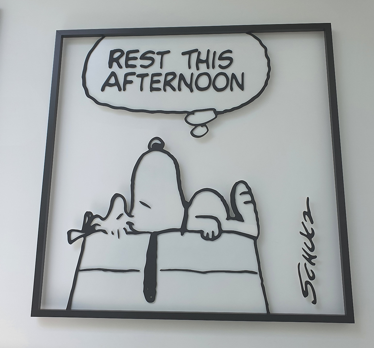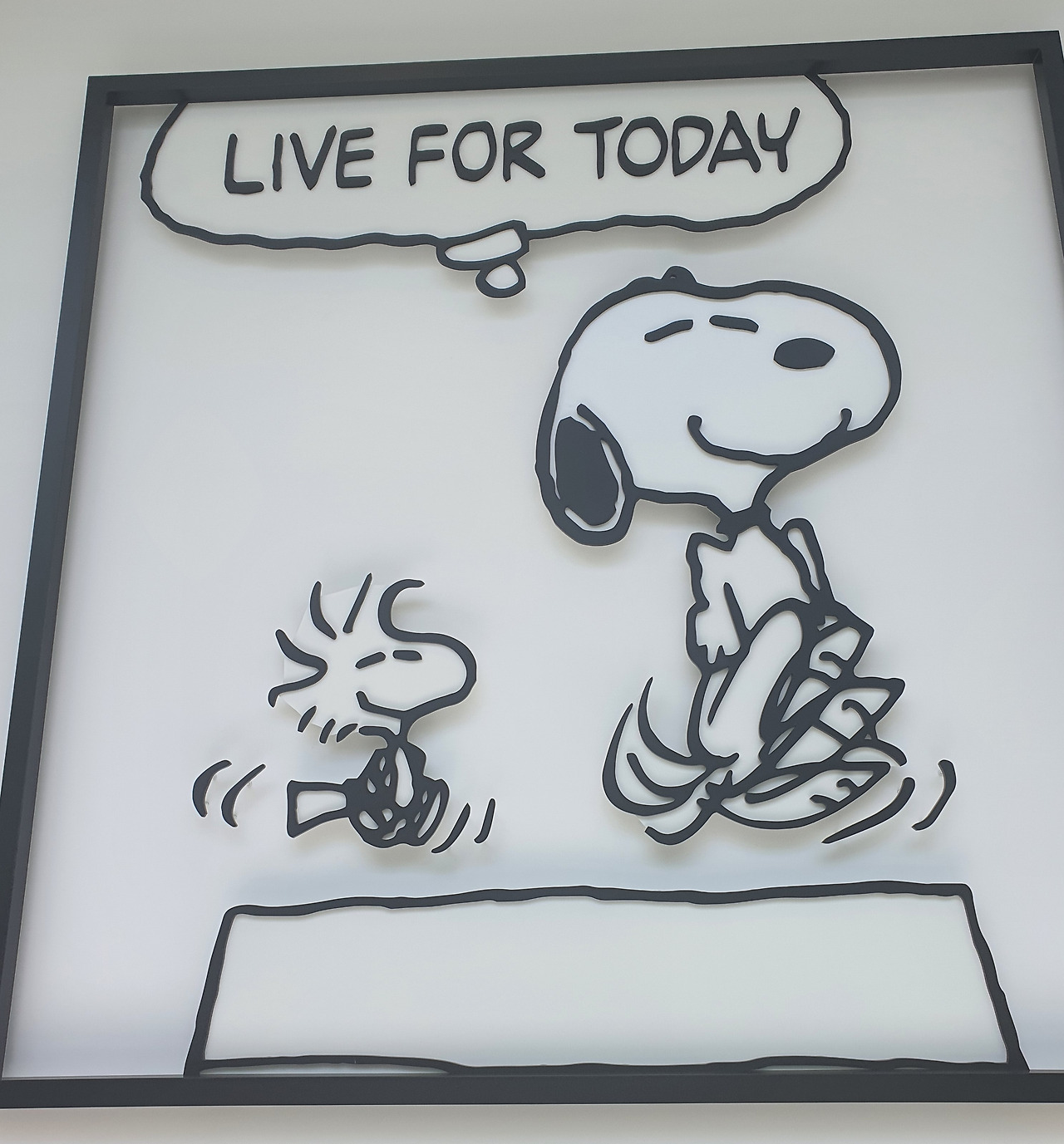입구부터 대형 스누피 그림과 문구가 인상적이다.'오늘을 살라.', '어제에서 배워라.', '오후엔 쉬어라'. 꼭 내게 말하는 것 같다.세 개 중에 난 스누피랑 우드스탁이 누워있는 장면이 제일 맘에 든다.아무것도 안 하고혼자 가만히 누워 있고 싶다.하하하.