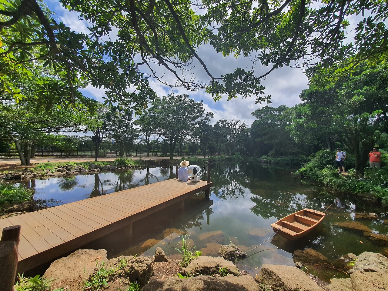 "여기 인생 사진 찍는 곳이에요. 2시간 기다려야 하는 곳이래요. 여기 찍으러 사실 왔어요."라고 그런다. 다행히 몇 사람 없어서 5분도 안 기다려도 될 것 같다. 그런데 자세히 보니 여기 실내에서 인상 깊게 봤던 해지는 풍경이다. 물이랑 스누피랑 하늘이 참 잘 어울린다.