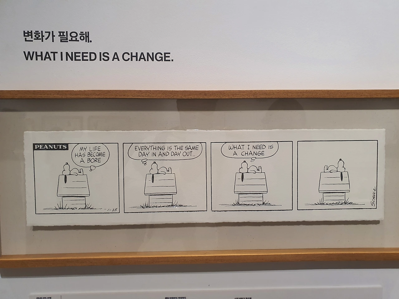 비싼 돈 냈는데 스누피 관련 내용을 잘 모르니 재미가 없다. 애써 만화에 집중해 보는데 집중도 잘 안 된다. 아이들도 재미없는지 어서 딴 데 가자고 난리다. 그나마 마음에 드는 만화가 한 두 개 있다.그 첫 번째가<변화가 필요해> 네 컷 만화다.
