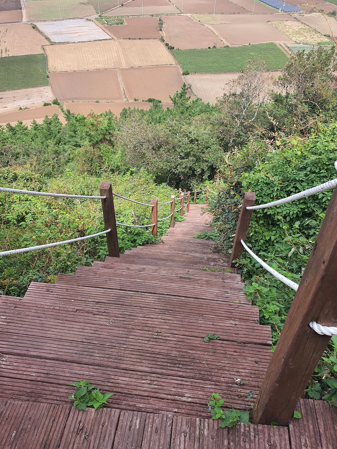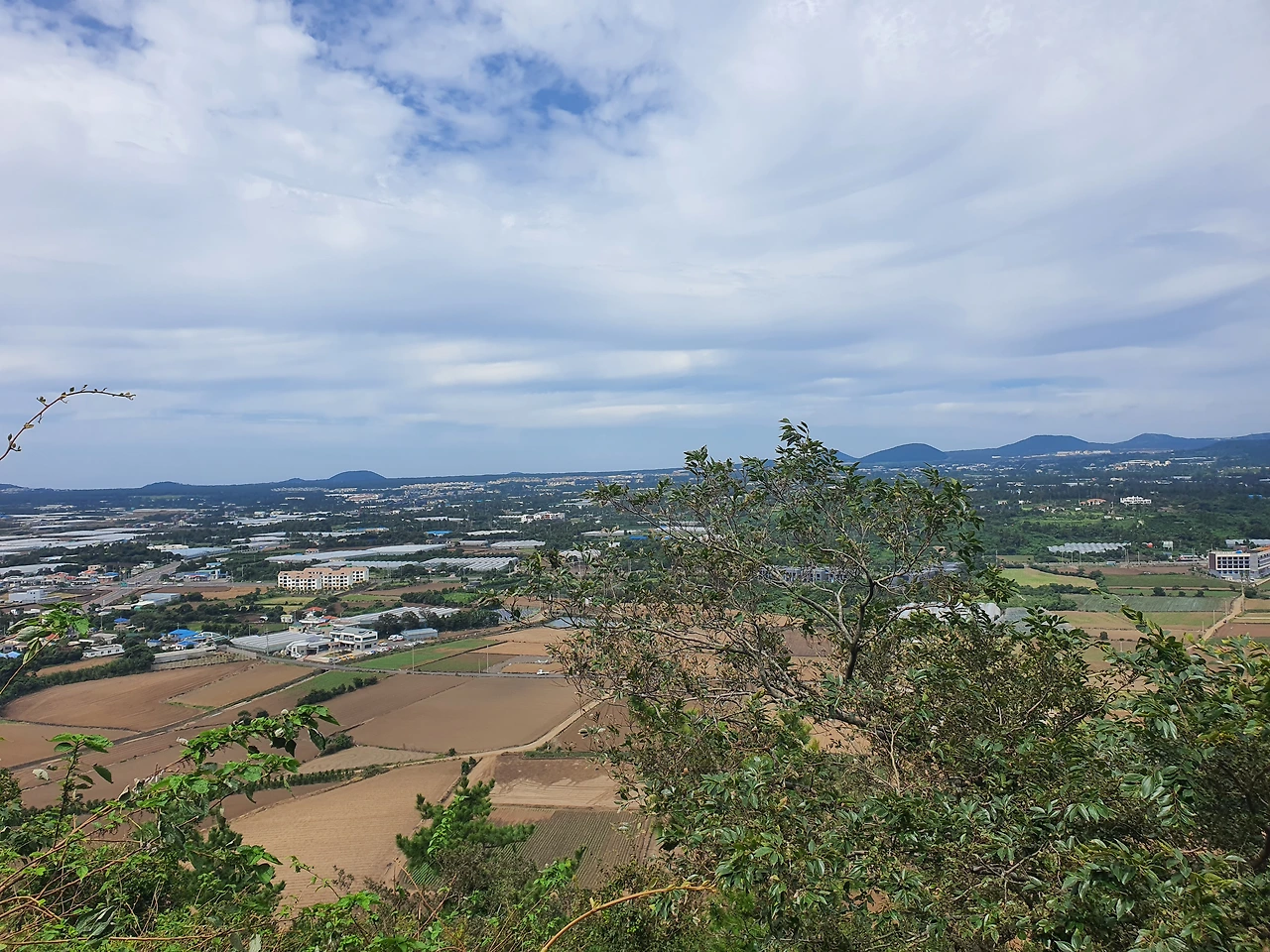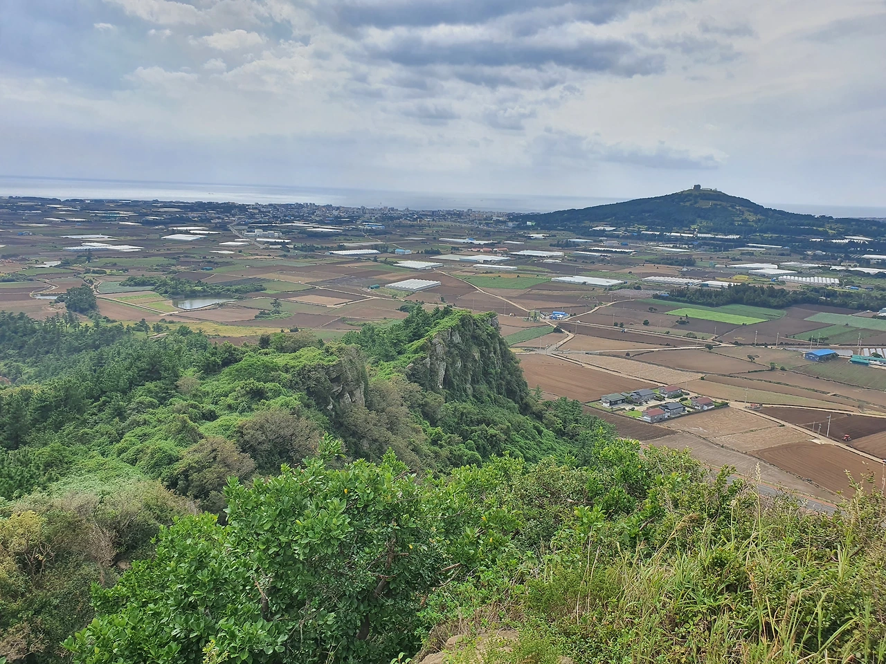 그렇게 10분을 걸었나 갑자기 오르막이 나온다. 계단이 갈수록 가팔라지더니 중간중간 바위 오르막도 나온다. 경사가 무려 70도 정도다. 저 멀리 대정읍을 바라보니 논밭이 네모 모양 퍼즐 조각 같다.