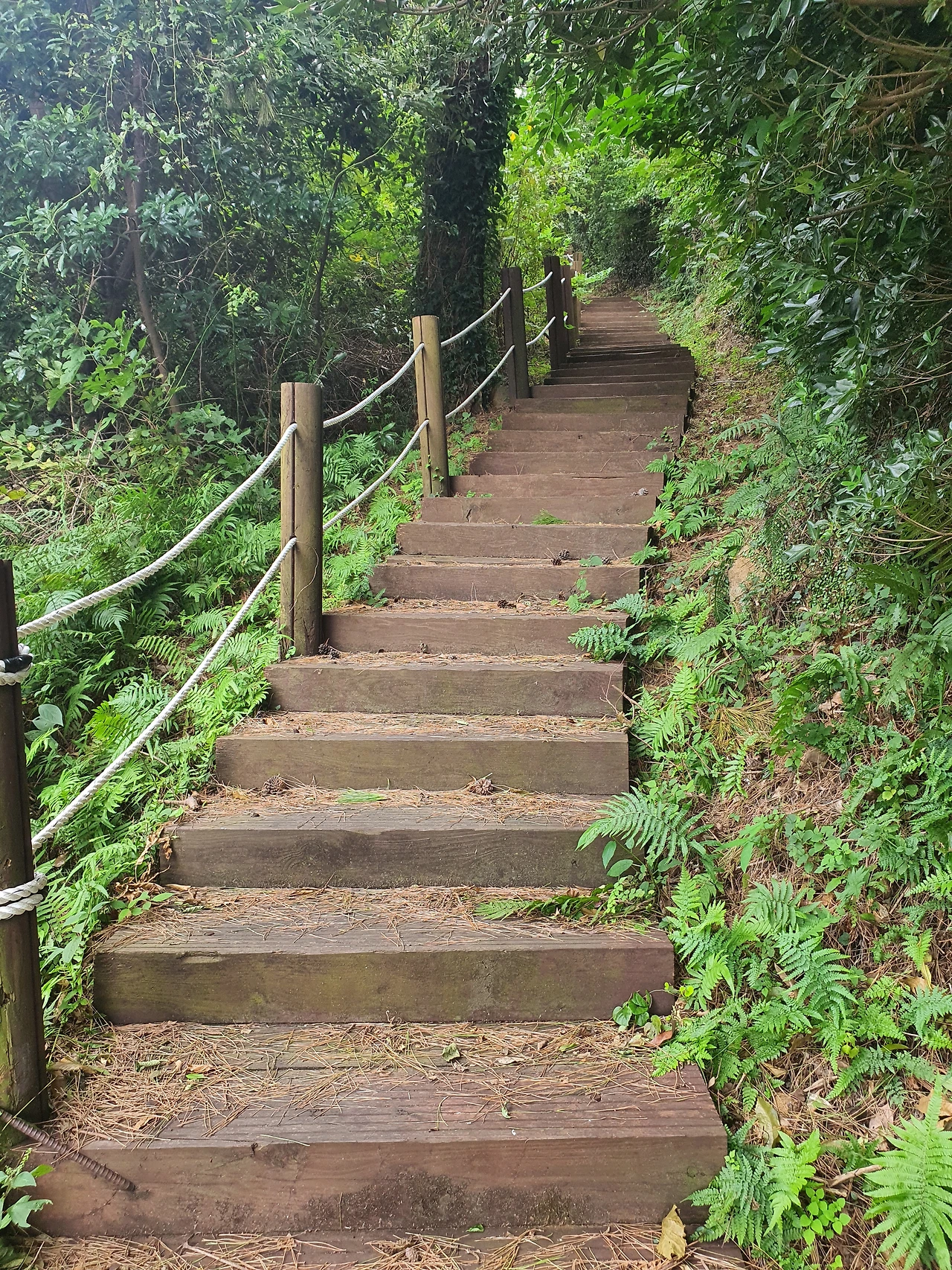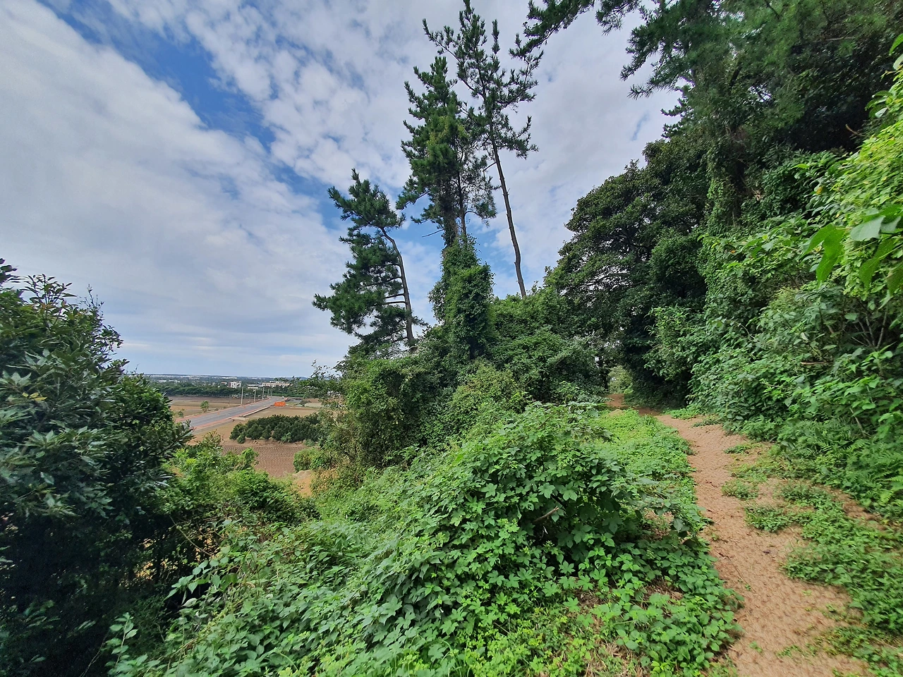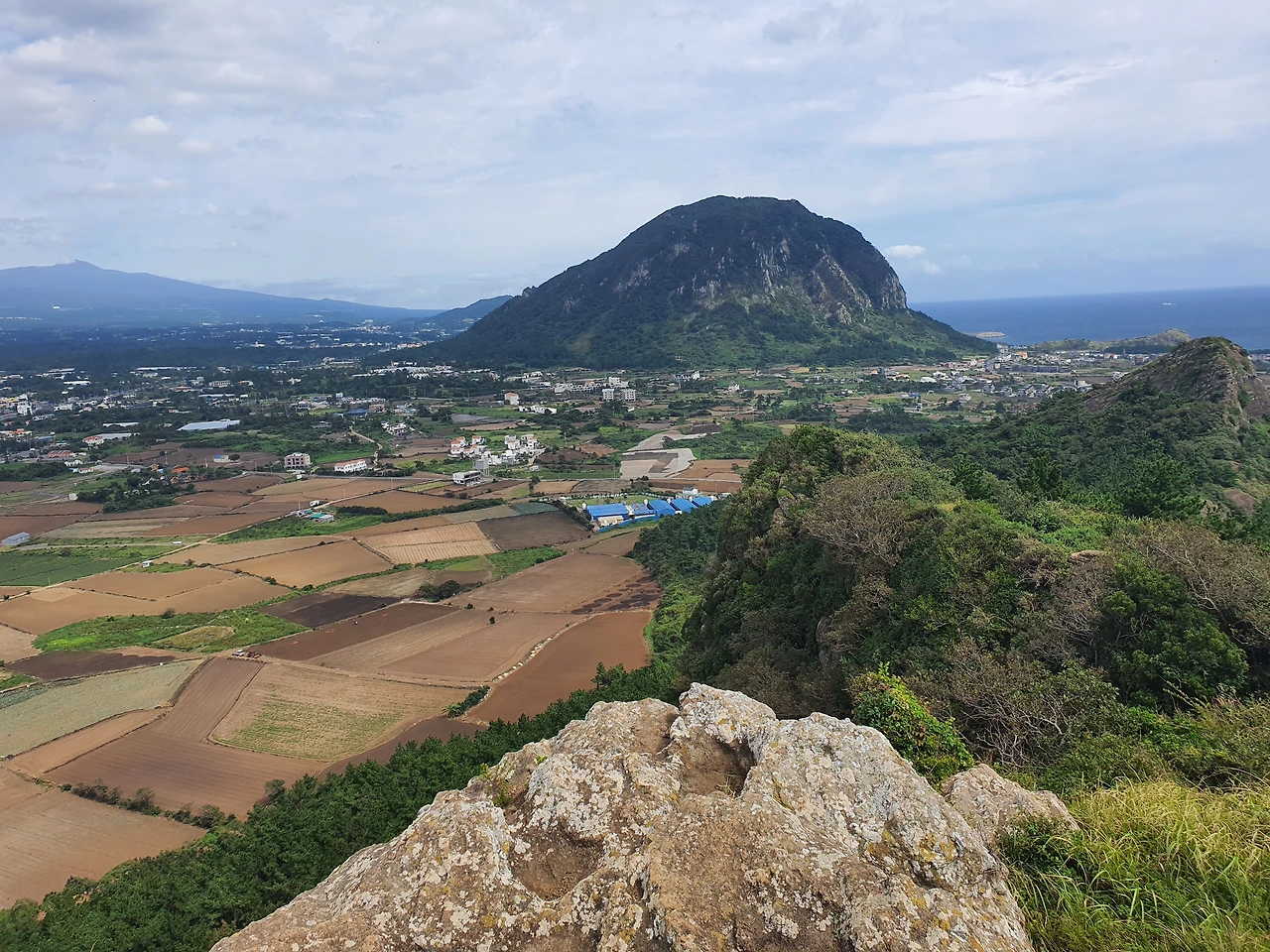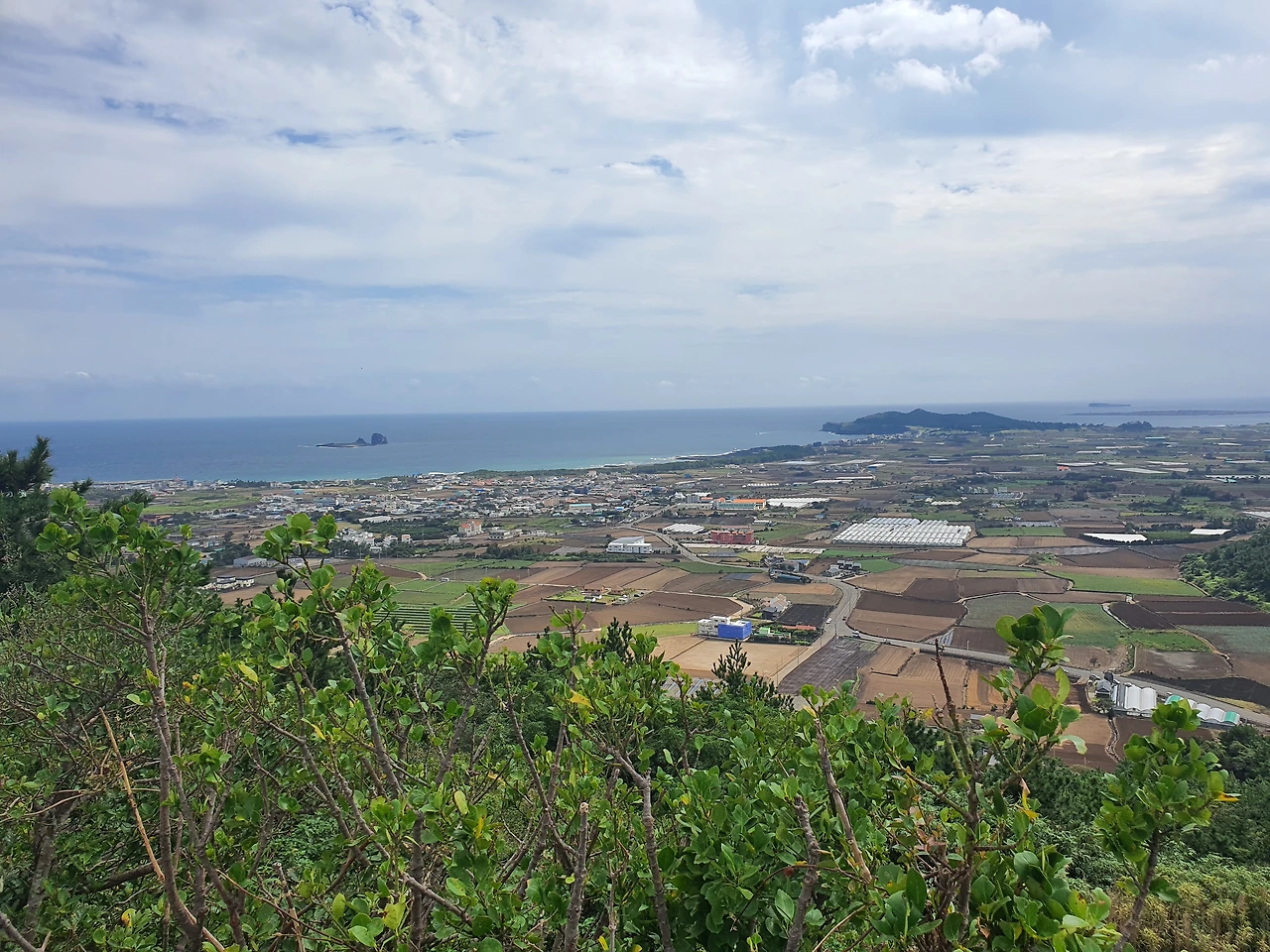 그렇게 10분을 걸었나 갑자기 오르막이 나온다. 계단이 갈수록 가팔라지더니 중간중간 바위 오르막도 나온다. 경사가 무려 70도 정도다. 저 멀리 대정읍을 바라보니 논밭이 네모 모양 퍼즐 조각 같다.