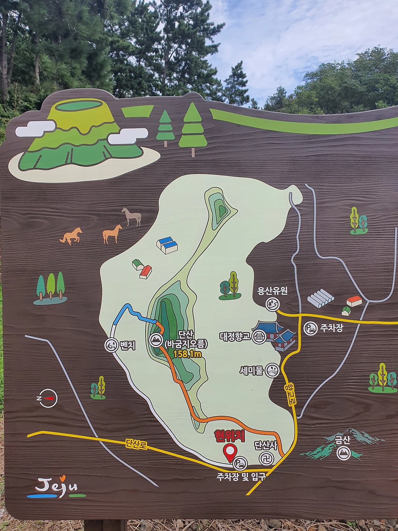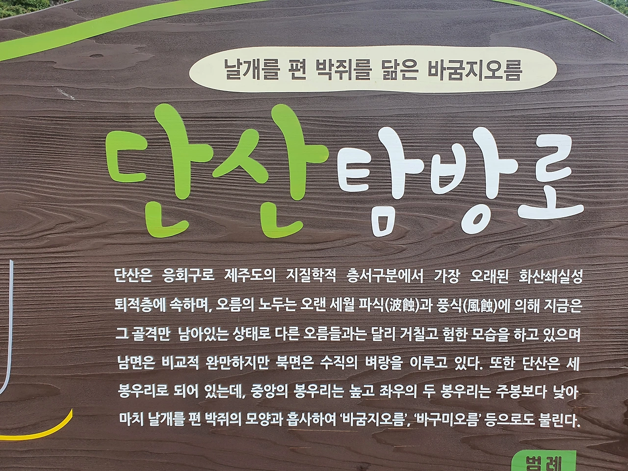 단산을 검색하니 박쥐를 닮아 '바굼지 오름'이라고 부른단다. 제주어로 박쥐를 '바구미'락 한다니 이해가 바로 간다. 그러고 보니 목침 모양이 아니라 박쥐가 날개를 딱 펼친 모양이다. (단산을 '바굼지 오름'이라고 부르는데, 바굼지는 제주어로 바구니라고 하고, 바구니를 엎어놓은 모양에서 연유하기도 한단다.)
