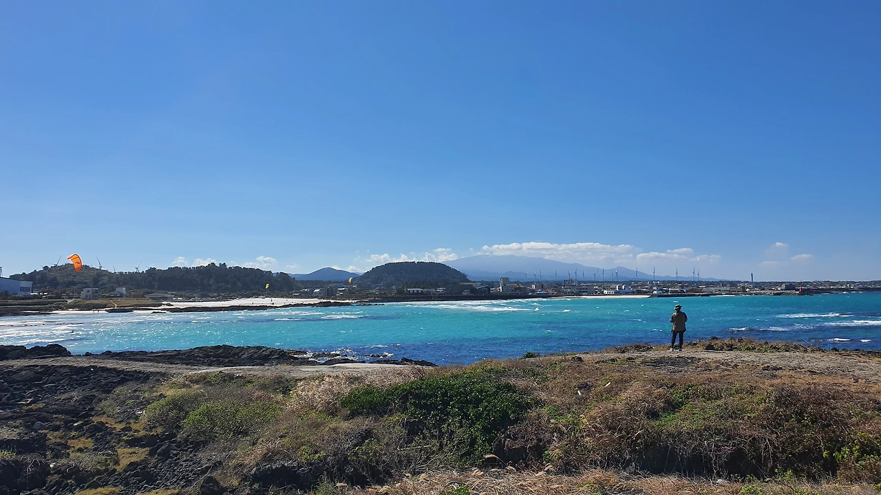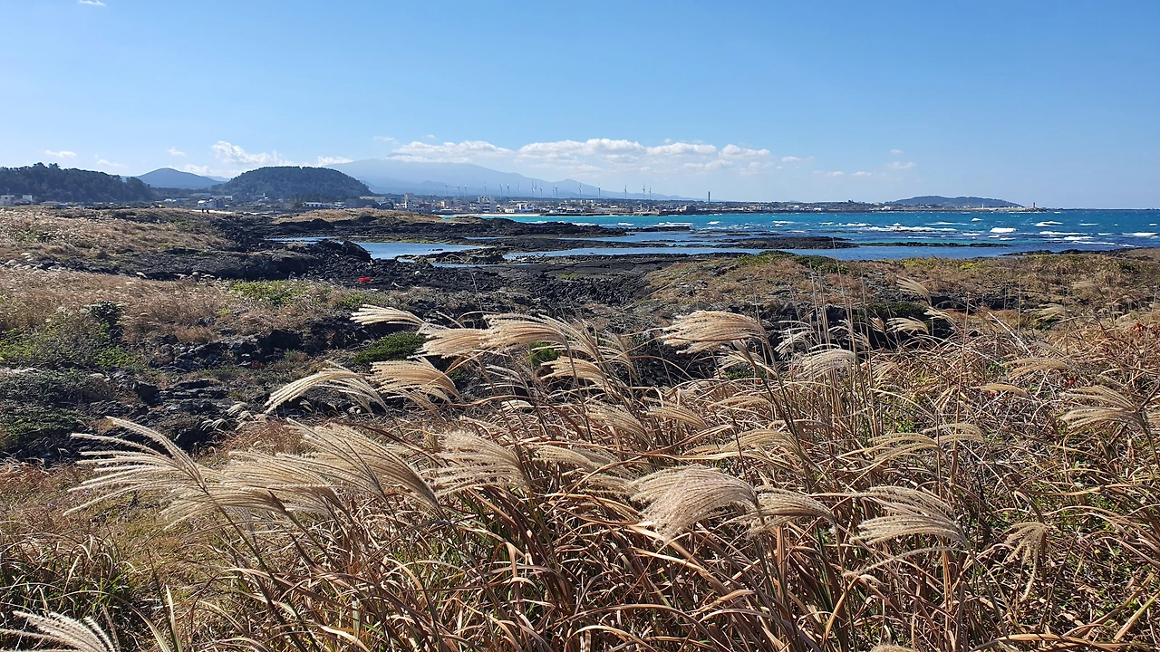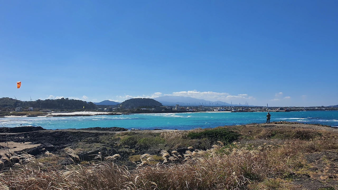 그러고 보니 여기 풍경이 특별한 이유가 있다. 제주 하면 생각나는 모든 것들이 사진 한 장에 다 있다. 영롱한 애매랄드 색 바다와 새하얀 파도. 저 멀리 하양 구름 아래에 실루엣을 드리우고 있는 한라산. 줄지어 서서 돌아가는 풍력발전기. 팔랑팔랑 가을바람에 흔들리는 억새들. 그 풍경이 사진 한 장에 다 들어 있다.
