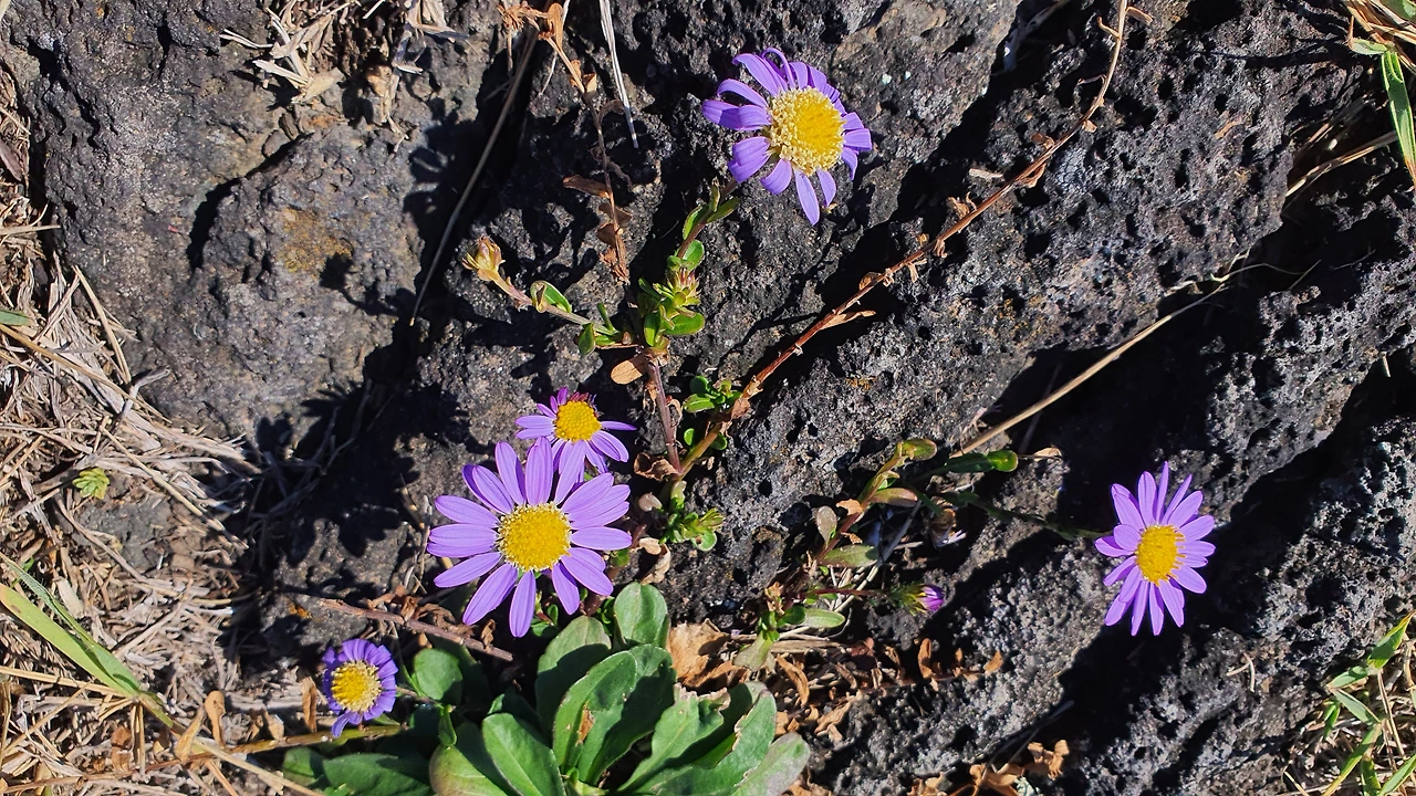 '김녕 월정 지질트레일'이라는 이정표 길을 따라 걷는다. 검은 현무암 사이로 연보라색 꽃이 눈에 확 들어오는데 참 이쁘다. 이름이 궁금해서 알아보니 '눈개쑥부쟁이'라고 한다. 노란색 동그라미에 연보라색 꽃들이 검은 현무암과 찰떡궁합이다. 예쁘다. 예쁘다. 예뻐.