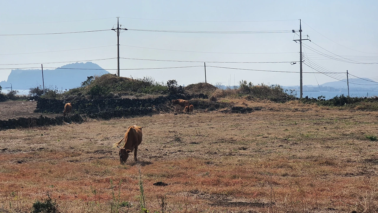 정신없던 도로에서 벗어나 우도 마을길로 들어서니 갑자기 조용하고 평온하다. 길은 조금 돌아가는 길이지만 마을길이 주는 편안함이 마음에 든다. 돌담 위에 팔랑거리는 올레길 리본이 반갑다고 손짓한다. 저 멀리 보이는 우도봉과 돌담이 주는 아늑함에 발걸음이 가볍다. 소들도 풀밭에서 자유롭게 한가롭게 풀을 먹고 있는데 그 모습에 괜한 미소가 지어진다.