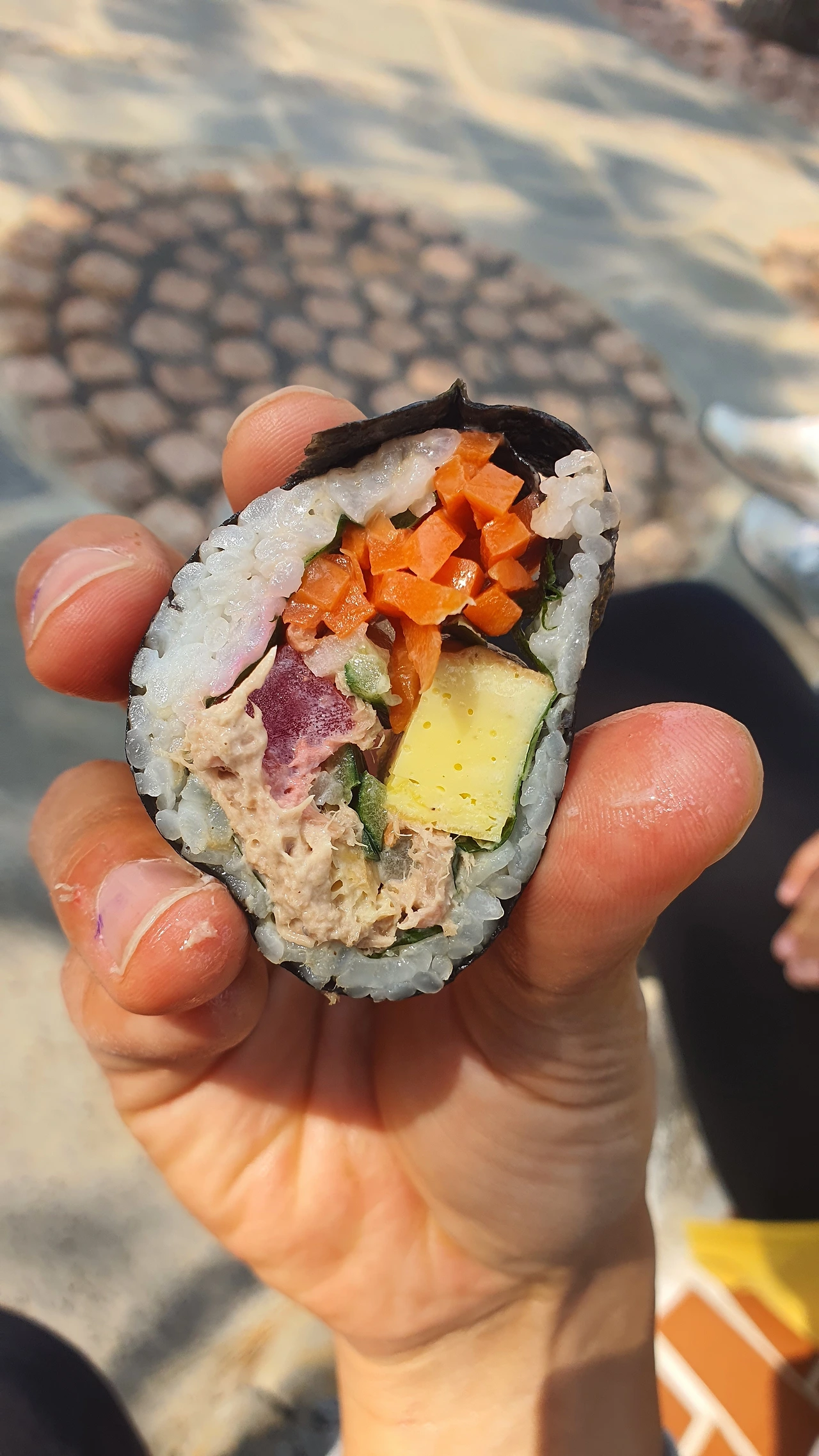 천진항을 지나 우도봉 아래에 새로 생긴 훈데르트바서 파크가 나온다. 제법 걸었더니 배가 고프다. 돌 벤치 위에 앉아서 성산항 근처에서 산 '착한 마녀 김밥'을 꺼내 먹는데 자극적이지도 않은 건강한 맛에 맛있다는 소리가 절로 나온다.