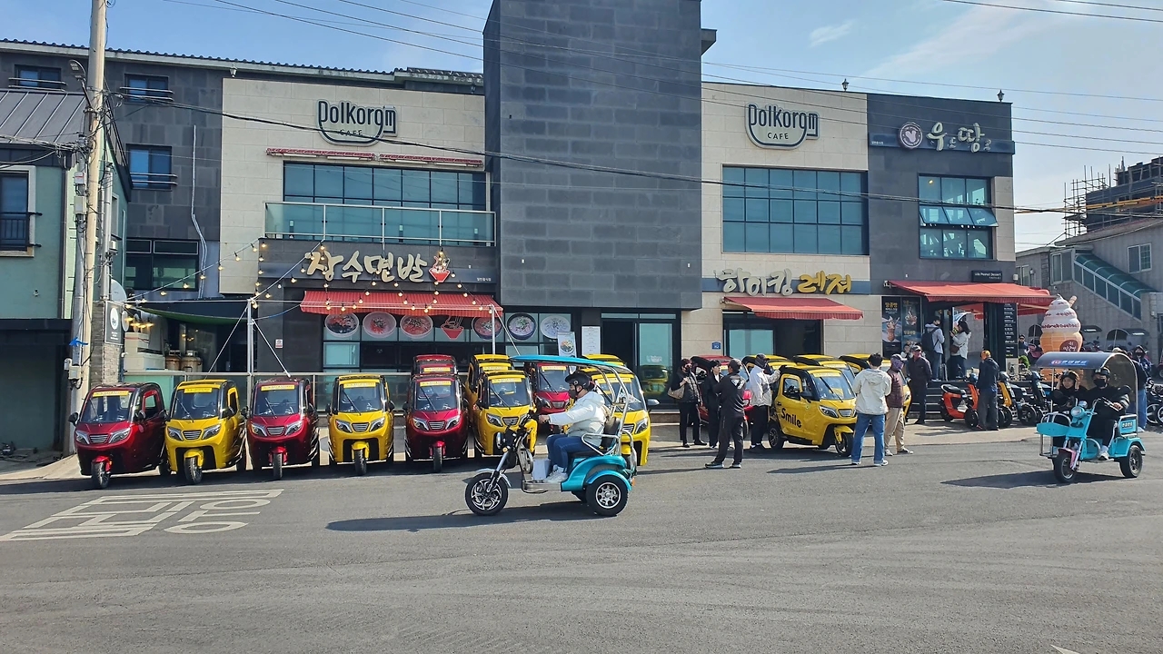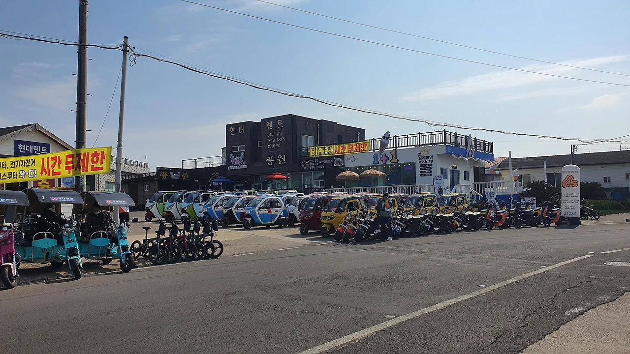 우선, 가게 앞에 진열된 전기자동차가 많아도 너무 많다. 전기 자동차 가게가 하나면 말도 안 하겠는데 그 가게들이 포구 입구에 줄지어 6개는 넘는다. 수십대가 넘는 전기자동차를 보니 마치 전기자동차를 보러 우도에 온 듯한 착각을 일으키게 할 정도다.