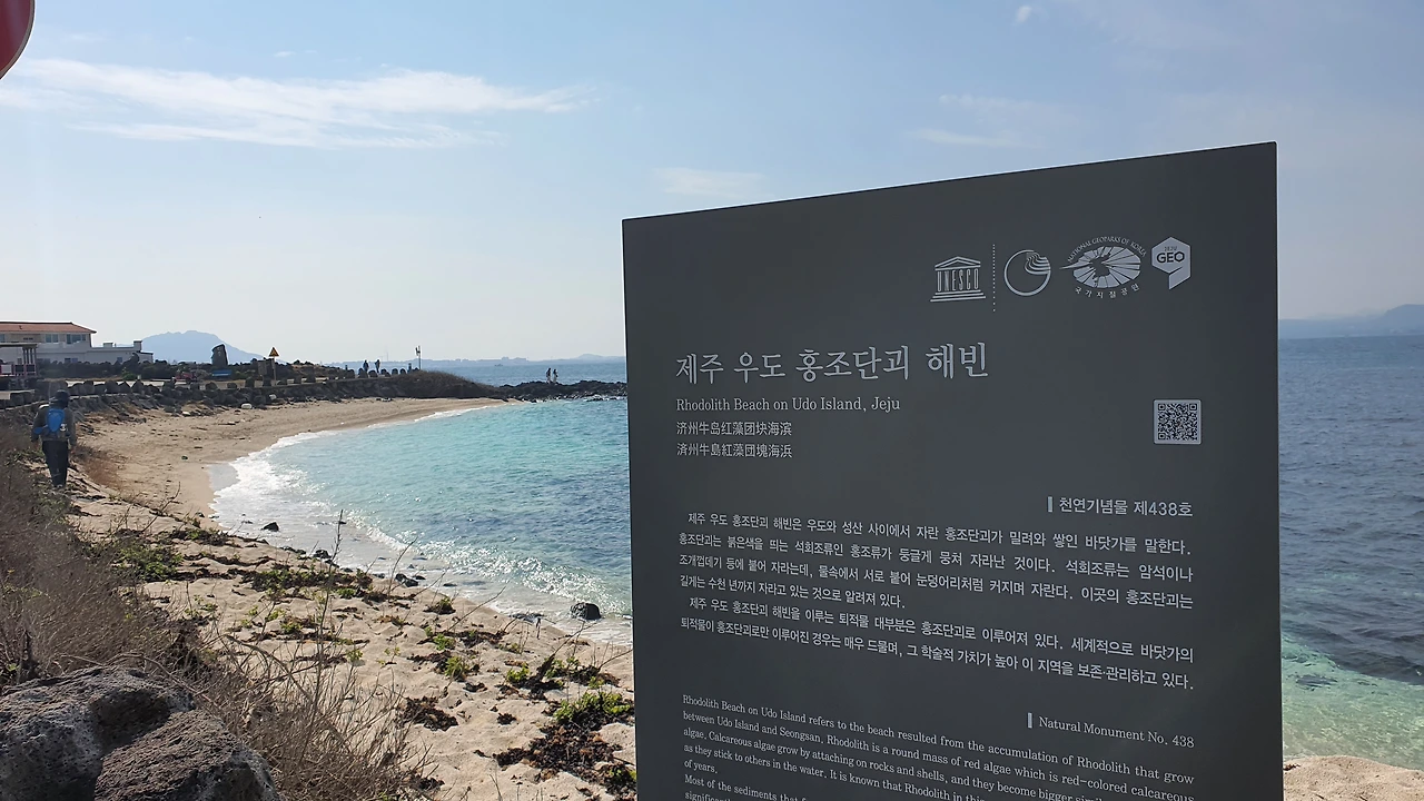 내려가서 실제 맞는지 확인해보니 정말 모래가 아니다. 하얀 공 모양 같은 것들이 내 손 위에서 반짝반짝 빛나고 있다. 그제야 신기하다 신기하다, 라는 생각이 물 밀려든다. 이런 역사적 가치가 있는 곳에 내가 서 있고, 그 홍조류들을 직접 만지고 있으니 감격스럽다. 오래오래 이곳이 잘 보존되었으면 하는 바람이 들었다. 홍조단괴와 쪽빛 바다가 주는 환상의 매력에 멍하니 한동안 바다만 보게 되었다.