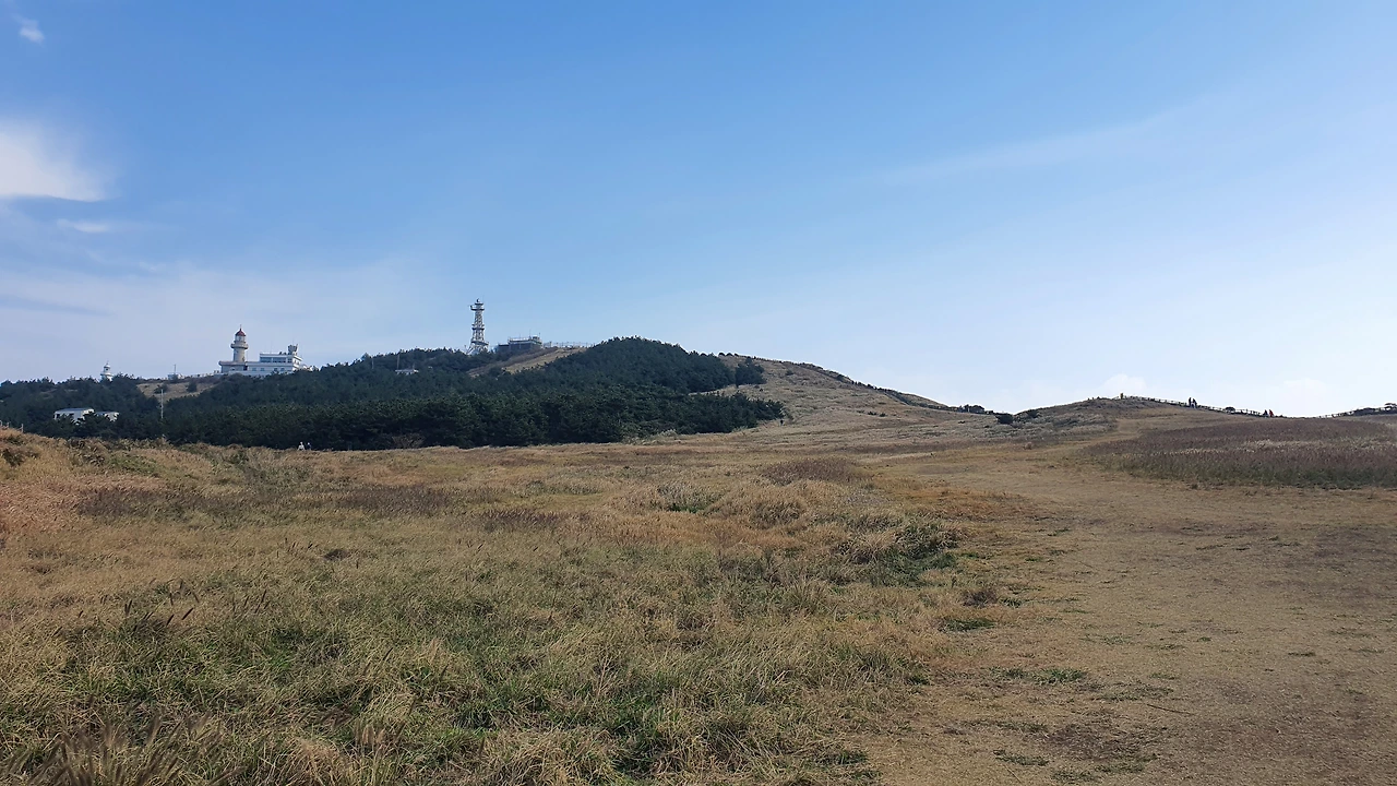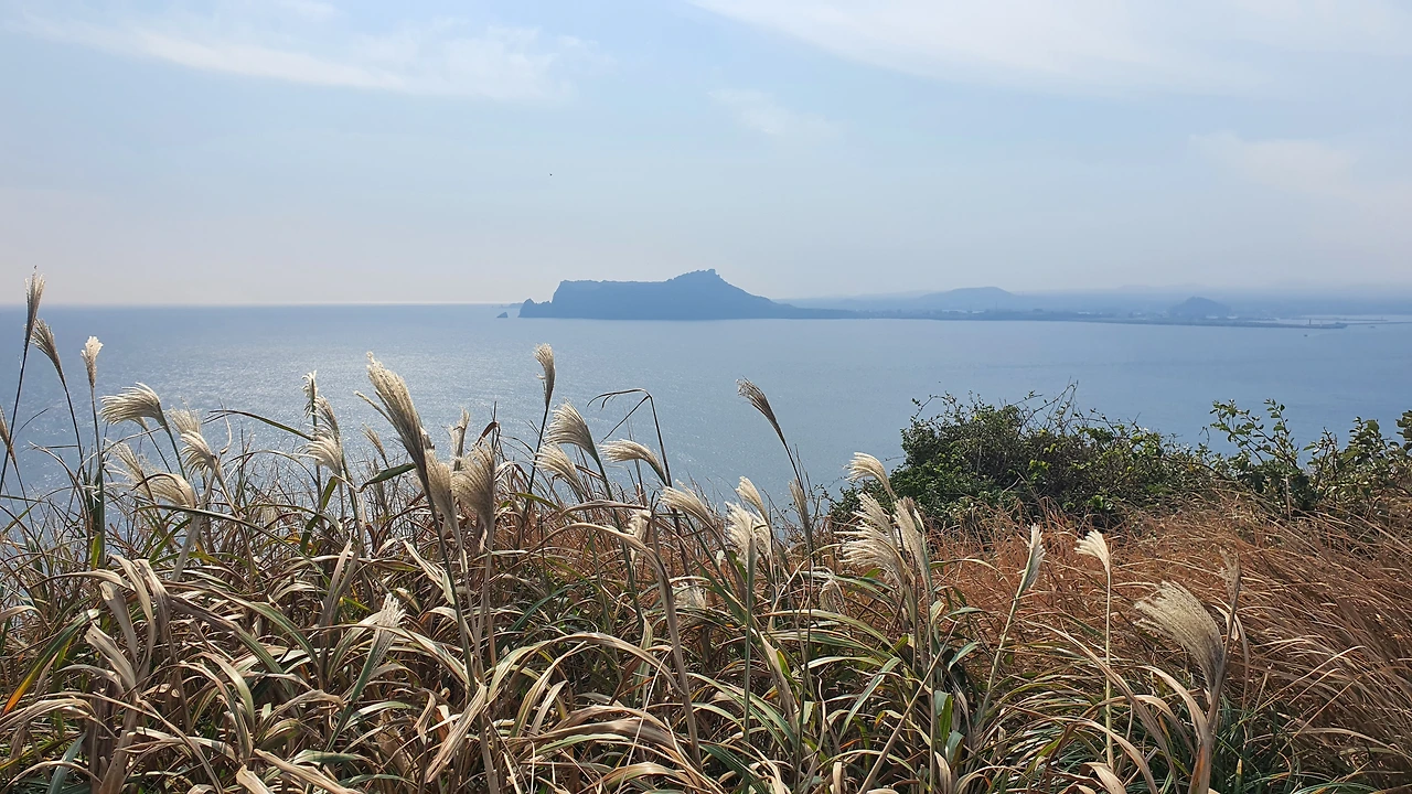 옛 추억이 이럴 때 도움이 된다. 한걸음 한걸음 올라가는 발걸음은 무겁지만 조금씩 오르면서 바라보는 높은 곳에서의 풍경이 참 아름답다. 특히나 저 바다 멀리 보이는 성산 실루엣이 오늘따라 예술이다. 시야가 좋지 않아 자세하게는 안 보이지만 그 나름대로의 묘한 성산 느낌이 물씬 전해져 온다. 살랑거리는 억새 뒤에 당당하게 서 있는 성산이 그렇게나 멋있다.헉헉 대며 오르는데내 뒤에 따라오는 가족의 대화가 참 웃기고 정겹다.