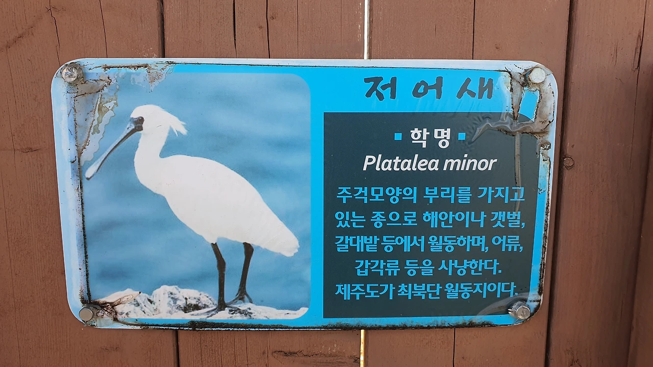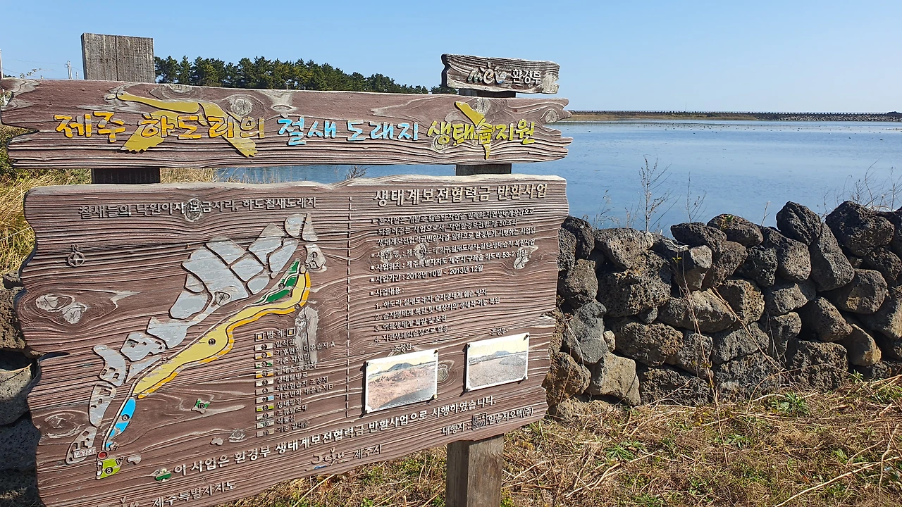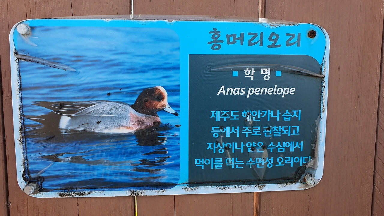 제주에 왔는데 새가 보고 싶다는 친구가 참 아이 같다. 동물을 사랑하는 친구의 마음이 참 곱다. 철새가 보고 싶다는 중문에 사는 친구를 위해 서귀포에서 하도 철새도래지까지 1시간을 달려왔다. 마침 주차한 곳(구좌읍 하도리 53-2) 앞에 새가 가득한데 어림잡아 300백 마리는 넘어 보인다. 저어새, 홍머리 오리, 왜가리, 물닭 등 새 설명이 있어 어떤 새가 여기에 있는지 쉽게 알 수 있다.