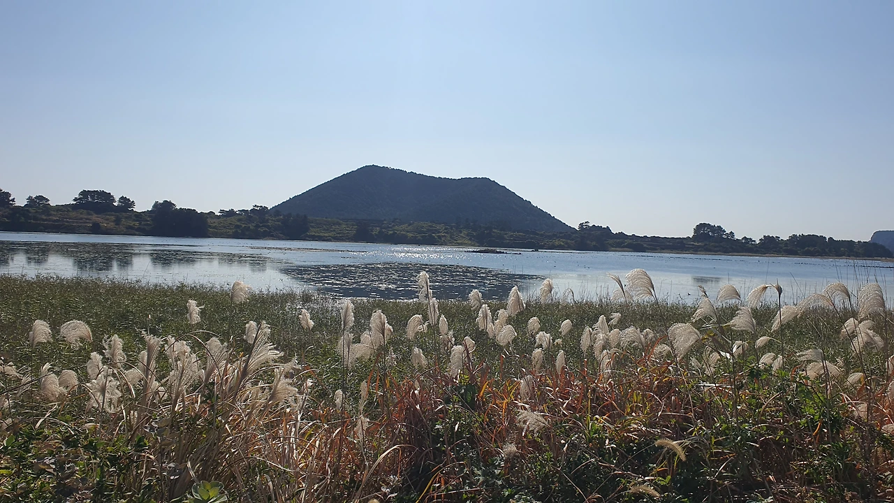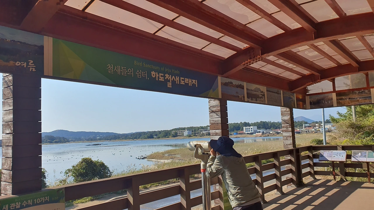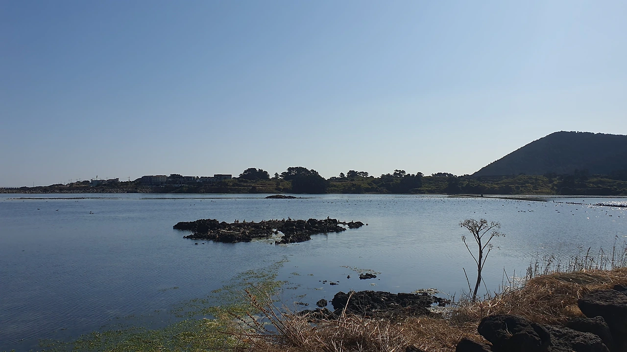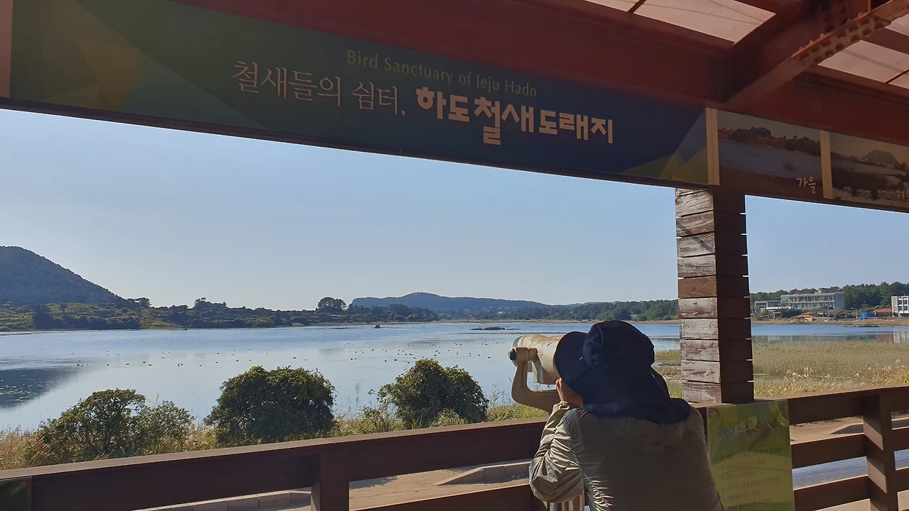 새 관찰을 하러 망원경이 있는 곳으로 친구와 둘이서 천천히 걸어가는데 풍경이 끝내준다. 우뚝 솟은 지미봉 아래로 11월의 따스한 가을 햇살을 받아 물은 반짝반짝거리고 새들은 여유롭게 휴식을 취하고 억새는 하늘거리는 데 여긴 완전히 또 다른 제주다. 하도 해수욕장 건너편에서 바라본 철새도래지의 풍경은 여기가 제주인지 우포늪인지 잊게 만드는 조용한 나만의 안식처 같았다.