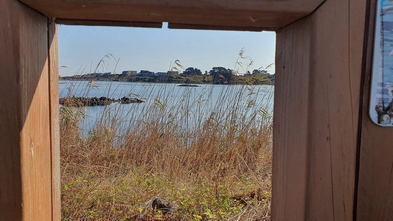 새를 관찰할 수 있게 조그만 네모 구멍도 있다. 하지만 두 눈으로는 한계가 있다. 조그만 구멍에 눈을 가져다 봐도 새가 자세히 보이지가 않는다. 친구가 안 되겠다 싶어 검색을 해 보니 망원경으로 관찰할 수 있는 곳이 근처에 있다고 그런다. 그 말과 동시에 하도 해수욕장 근처로 화장실을 찾으러 갔던 아내가 '망원경'이 있는 곳을 찾았다며 위치를 알려준다.