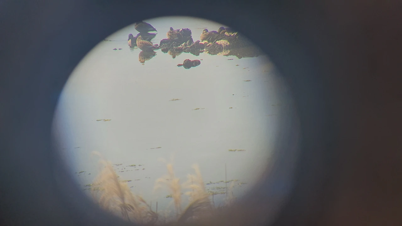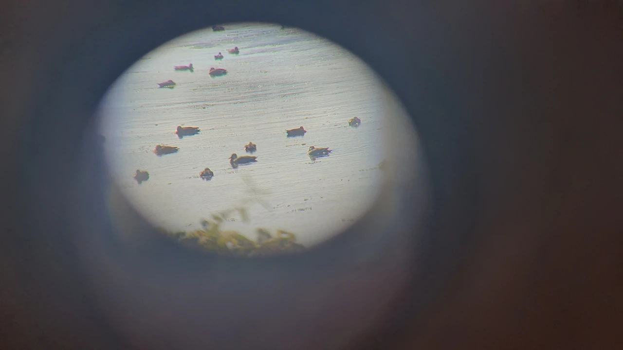 친구가 다 보고 나에게 망원경을 건네준다. 친구의 말이 맞다. 그냥 형체만 보이던 새들의 모습에서 눈, 부리, 깃털까지 하나하나 다 보인다. 멍하니 앉아있는 이름 모를 오리들이 제일 많고, 물살을 가로지르며 머리를 앞뒤로 움직이는 물닭이 그다음으로 많다. 저 멀리 검은색 가마우지들도 보이고, 왜가리와 백로들도 한 둘 보인다. 휴대폰 렌즈를 망원경 가까이해서 이 모습을 담고 싶은데 초점과 각도 맞추기가 어렵다. 겨우 노력해서 한 두 개 건졌다.