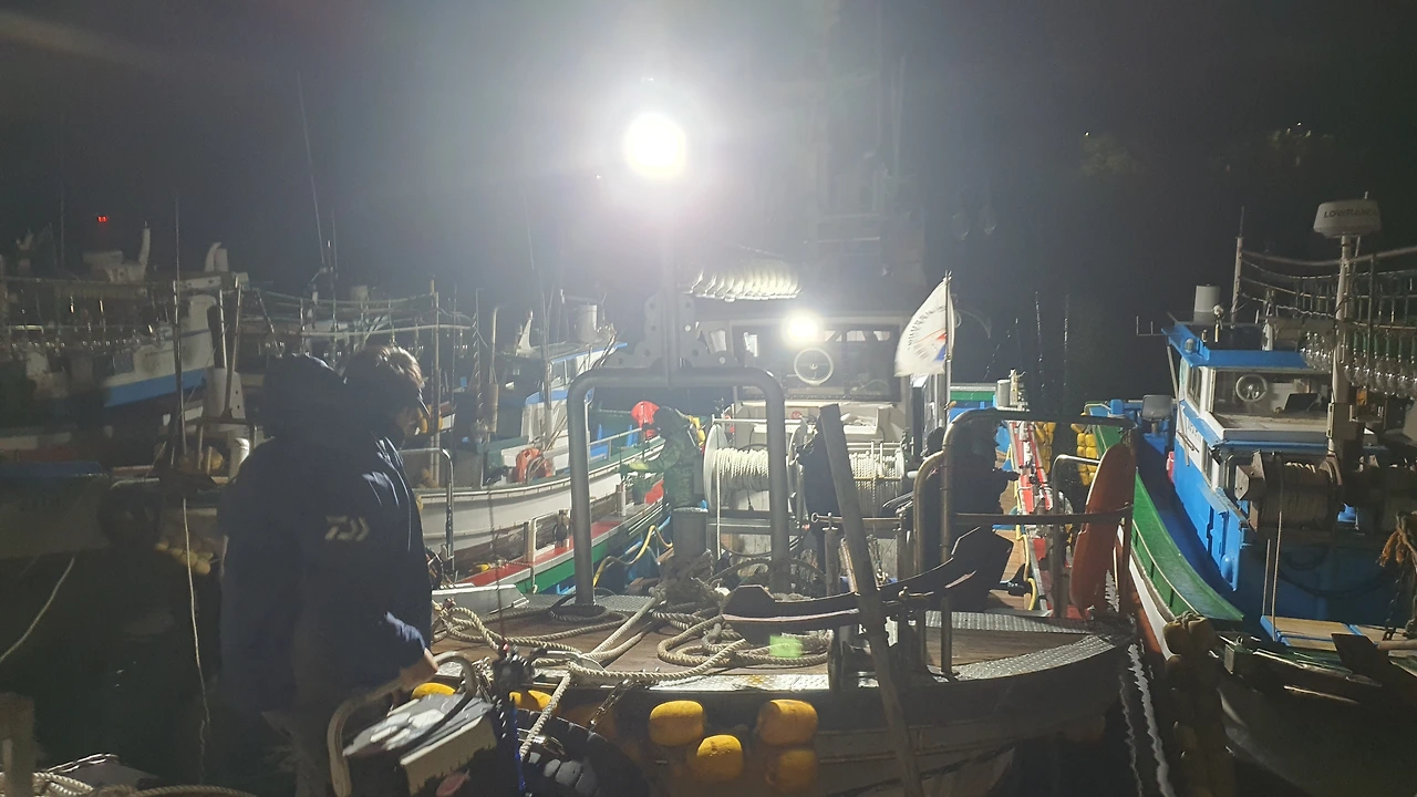 이 깜깜한 어둠 속에 환한 불을 밝히고 있는 배를 보니 마음이 설레었다. 자리 추첨도 잘 되어 배 맨 뒤쪽에 자리를 잡았다. J아버님은 배에 타시자마자 엄청 바쁘시다. 집에서 채비를 보통 다 해오는데 어제는 아내에게 미안해서 채비를 못 했단다. 그래서 열심히 낚싯줄을 이어시고 끊고 달고 하신다. 에기(물고기모양으로 수십 개의 바늘이 달린 부분)에 꽁치 조각을 달아 철사로 열심히 감고 계신다. 내가 제일 부러워하는 사람, 낚싯줄을 자유롭게 다루는 분이시다. 속으로 얼마나 감탄을 했는지 모른다.