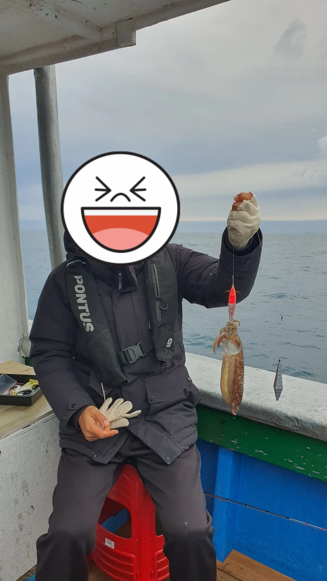 어묵탕의 힘과 전문가님의 코치로 이제 제대로 낚시를 해 보려 한다. 한 마리도 못 잡은 J아버님도 "이제 밑밥을 제대로 뿌렸으니 고기가 잘 잡힐 거예요."라며 농담을 하신다. 그 말에 웃음이 절로 나온다. 밑밥의 힘이었을까 코치의 힘이었을까 정말이지 내가 무슨 감으로 잡았는지 모르겠지만 연속으로 갑오징어 한 마리와 한치 한 마리를 잡았다. 다들 오늘 처음 하시는 분 맞냐면서 물어보신다. 하하하. (속으로 엄청 기뻤다.)