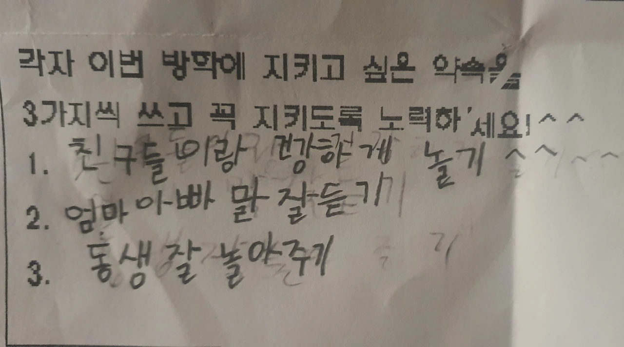 딸의 겨울 방학 목표, 엄마 아빠를 사랑하는 동생을 아끼는 마음이 잘 담겨 있다.