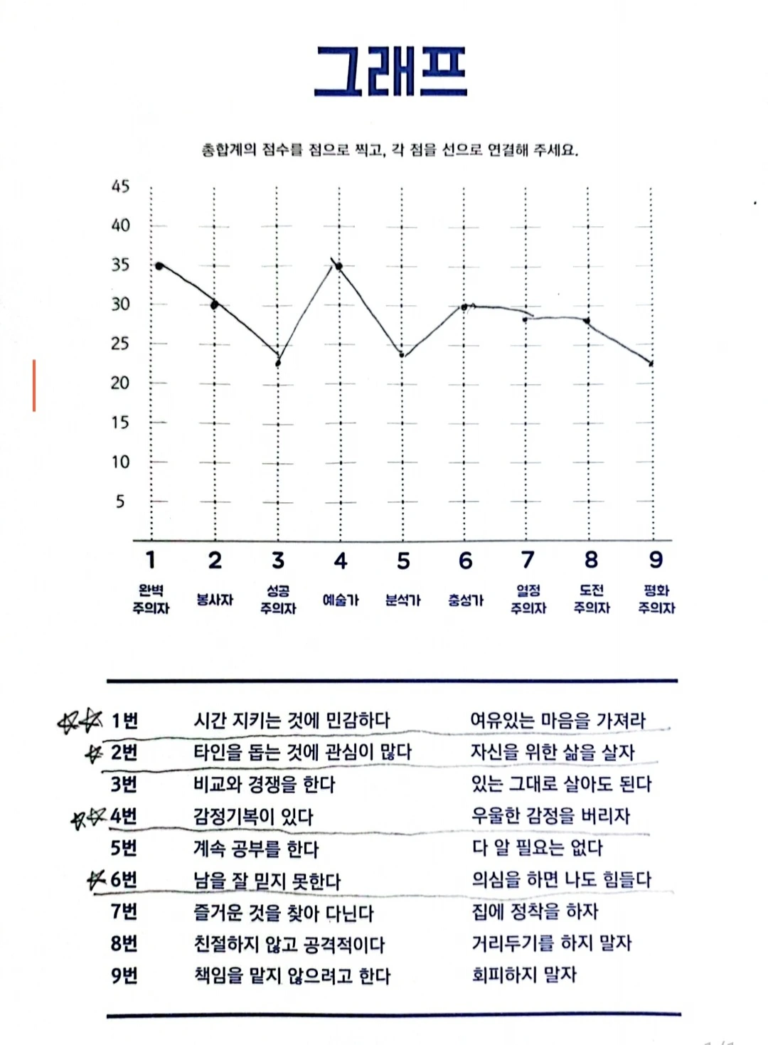 책을 읽기 시작하니 9가지 유형 중에 나의 에니어그램 유형이 궁금했다. 나의 유형을 알면 이해도가 빨라 몰입해서 책을 볼 수 있을 것 같았다. 친절하게도 검사지를 보내주셔서 10분 만에 81문제를 풀어보니 나의 에니어그램 그래프가 완성되었다.