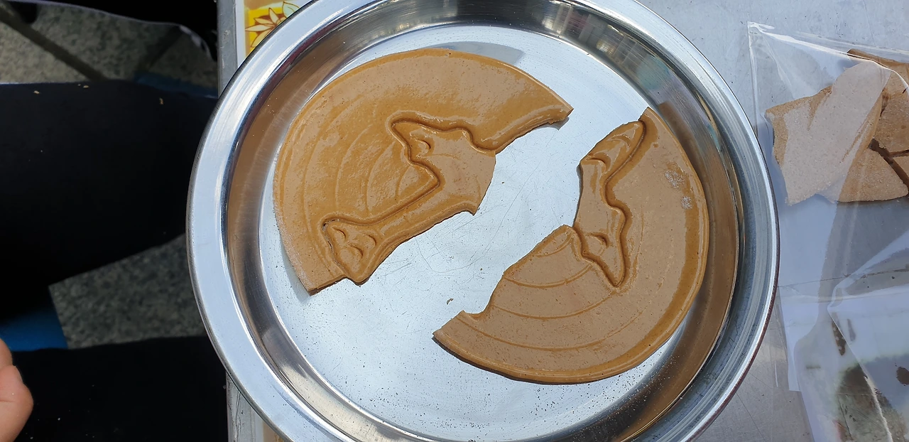 달고나 주문을 하러 가까이 간다. 설탕을 넣어 달고나를 열심히 젓는 남자 한 분과 달고나 뭉치를 던져주면 동그랗게 펼쳐서 모양을 찍으시는 여자 한 분이 주인이시다. 손놀림이 재빠르시다.