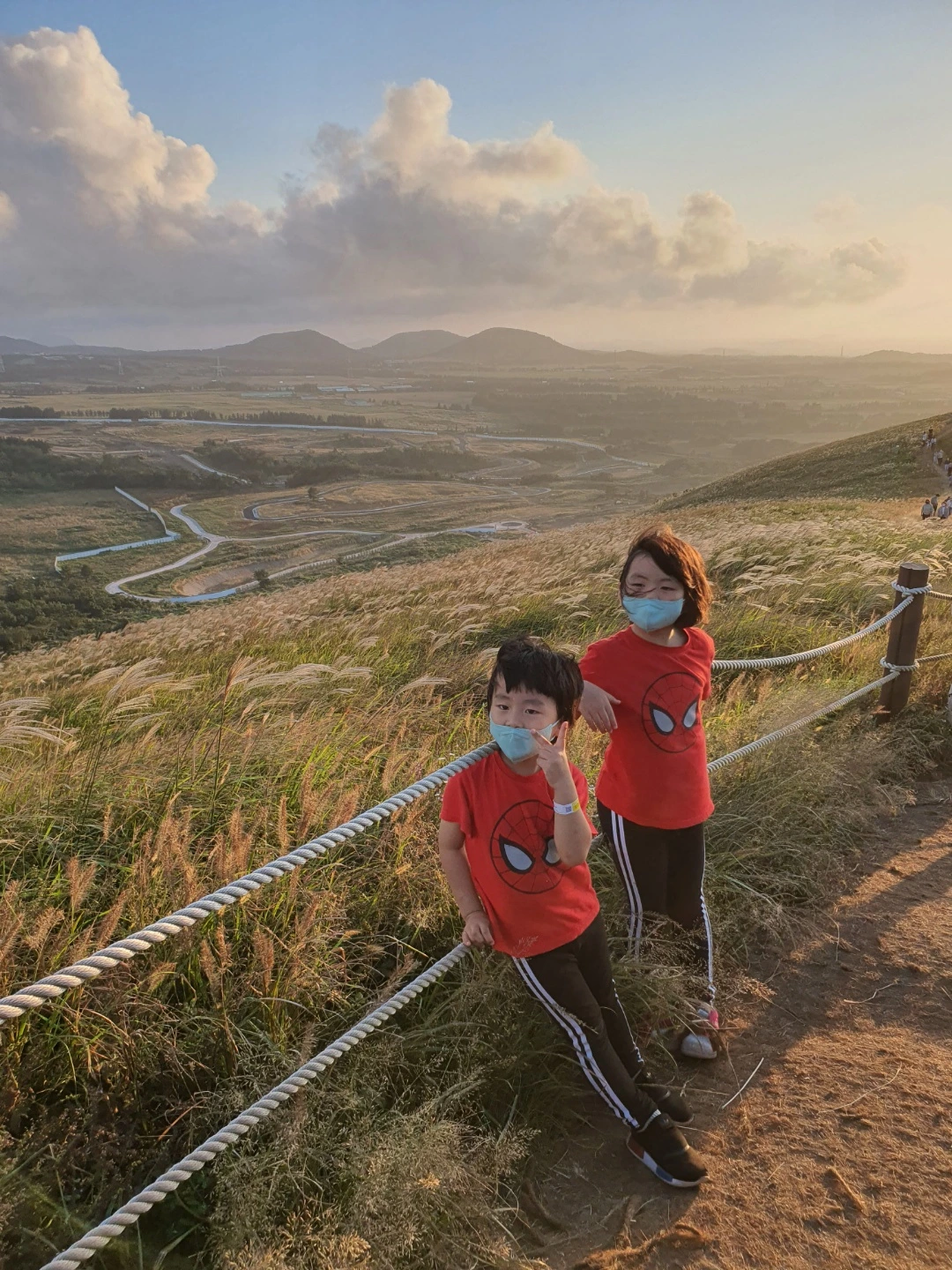 완만한 등산로가 갑자기 엄청 가파르다. 3분 정도 쉬지 않고 걸었더니 숨이 차 오른다. 쉬고 있으니 "아빠 운동 좀 해요!"라고 딸이 그런다. 잠시 숨을 돌려 바라본 풍경이 또 예술이다. 끝없이 펼쳐진 초록 들판에 억새들. 제주도에 왔음을 실감하는 순간이다. "아빠! 꼴등이래요, 꼴등이래요." 먼저 올라간 아들이 나를 보고 비웃는다.
